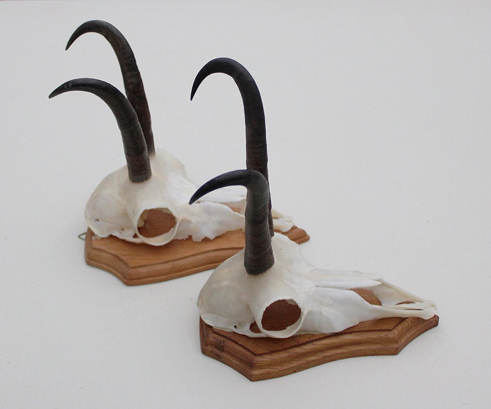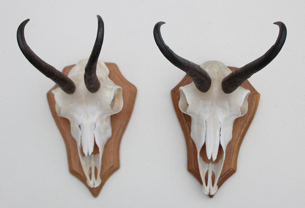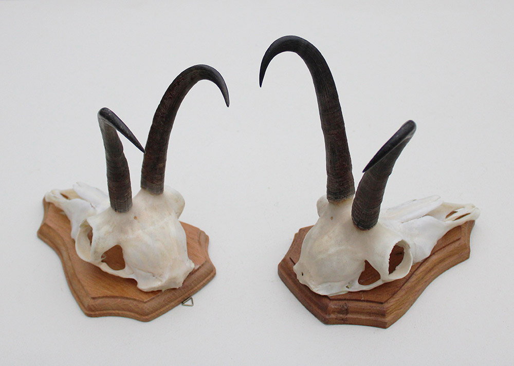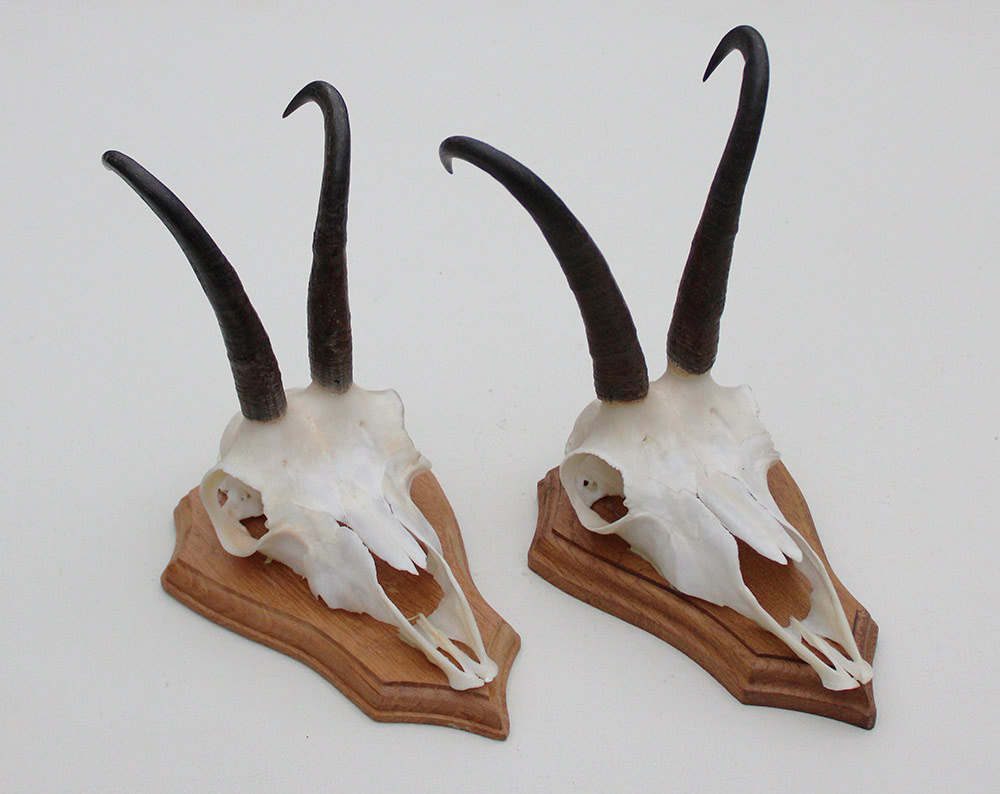 2 x GEMS hoorns / gewei op licht eiken schild. De lengte van de stangen ("krukken") bedraagt 20 en 22 cm. Maat schild 22 x 15 cm.