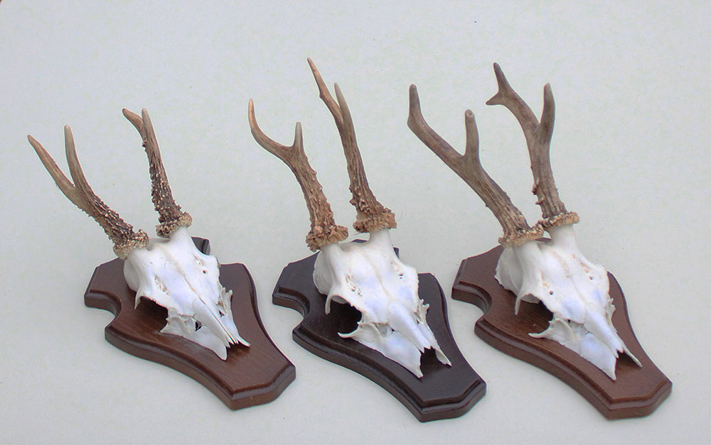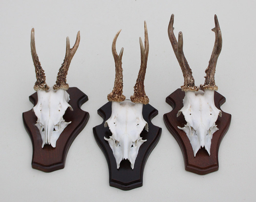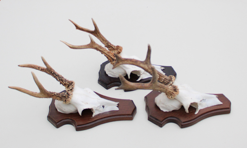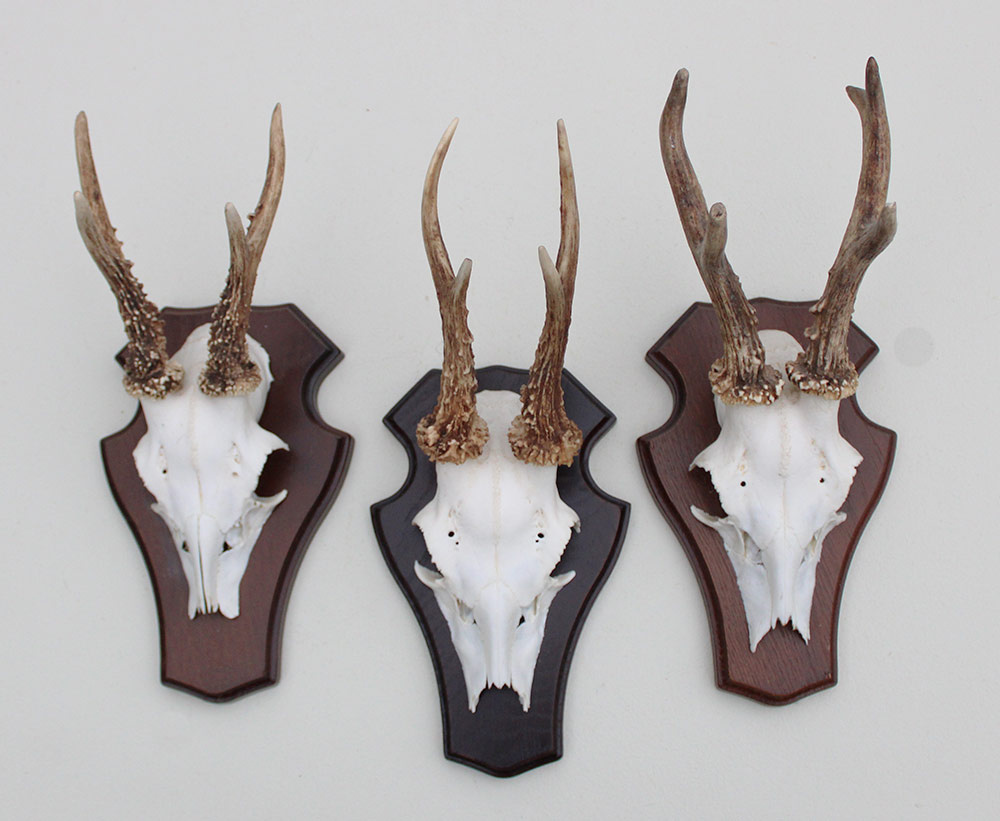 3 x Engels REE GEWEI op houten schild - aan de achterzijde voorzien van de kaakdeeltjes. Decoratieve set - de stanglengte bedraagt 15-17 cm.
