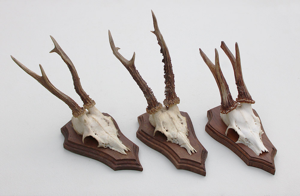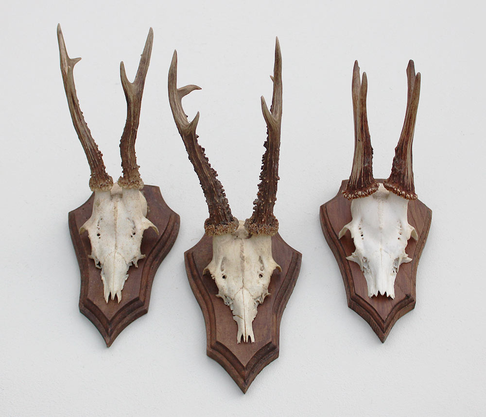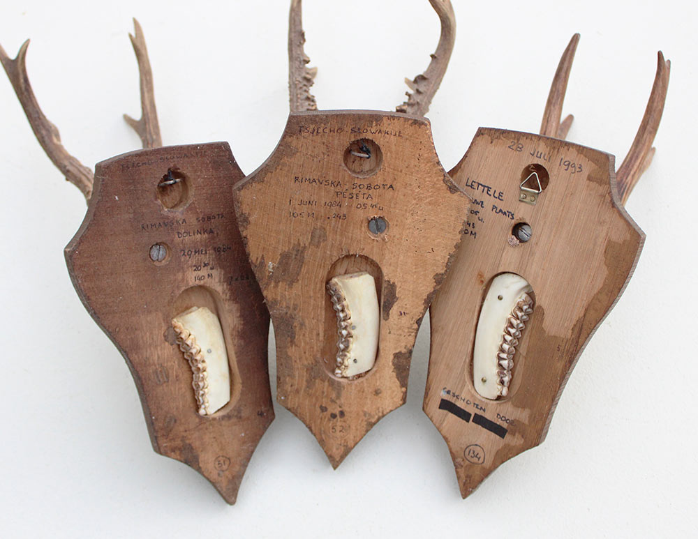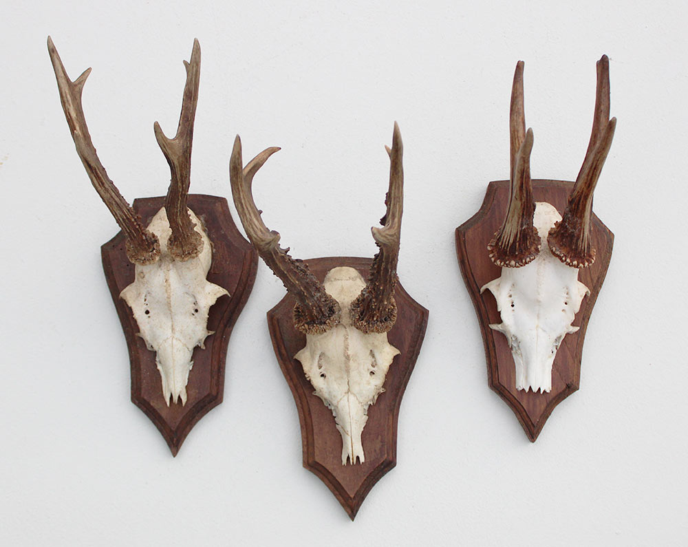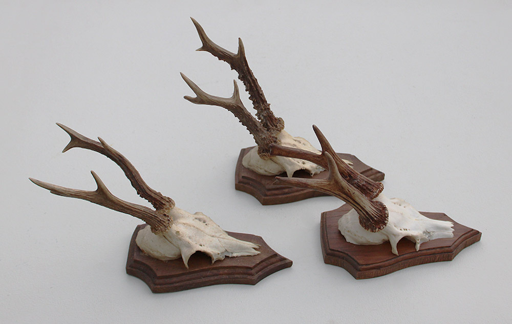 3 x REE GEWEI op eikenhouten schild.  Decoratieve set - de stanglengte bedraagt 17 - 20 cm. Aan de achterzijde voorzien van de kaakdeeltjes, plaats en datum.