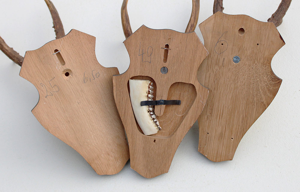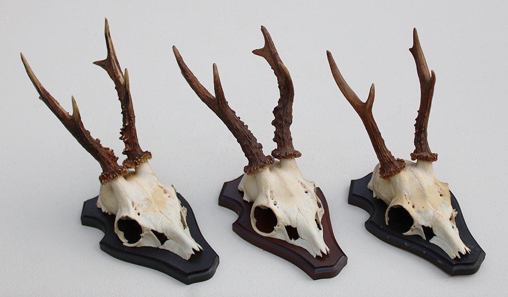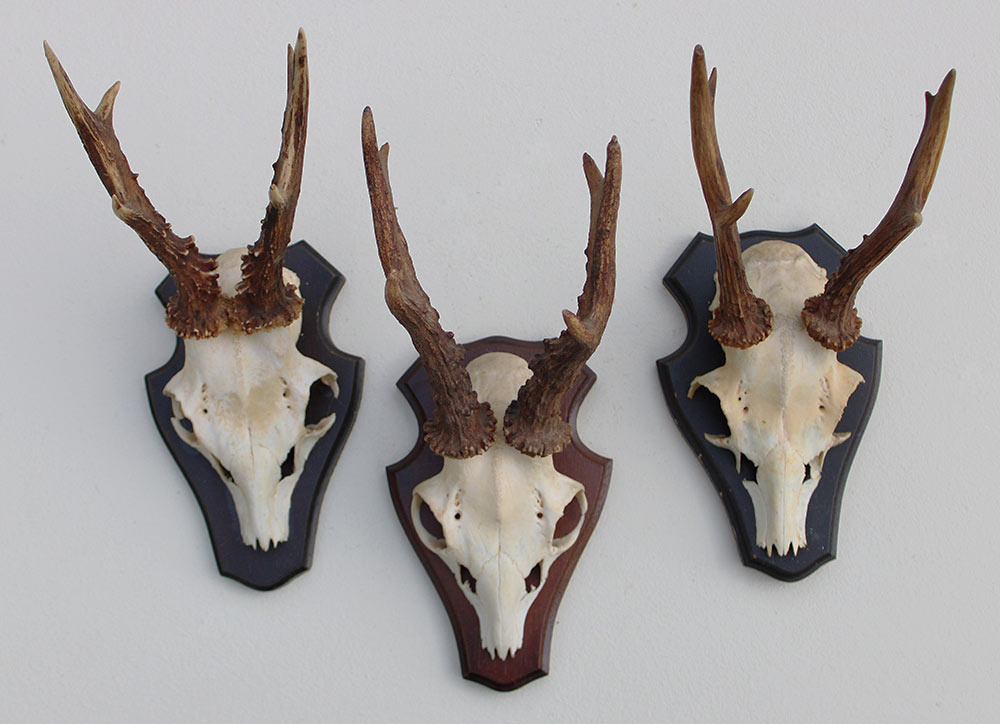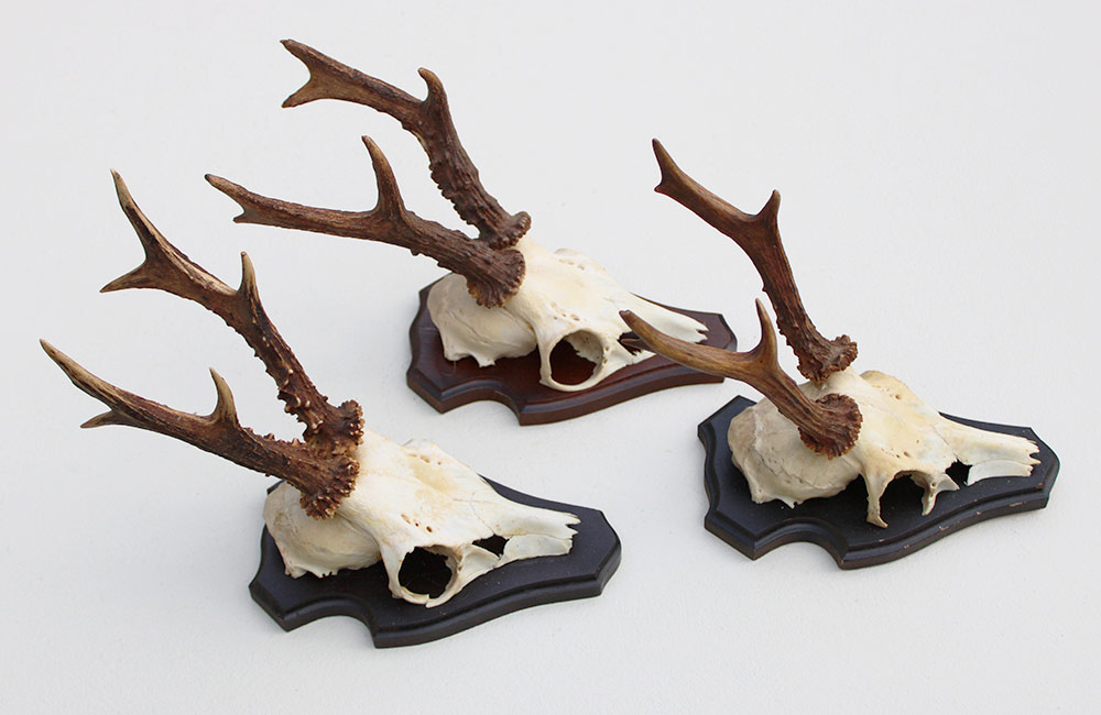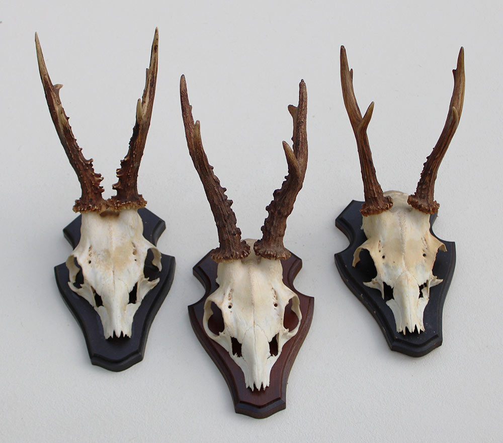 3 x REE GEWEI op houten schild. Decoratieve set - de stanglengte bedraagt 16-17 cm. 1 geweitje is aan de achterzijde deel voorzien van kaakdeeltje.