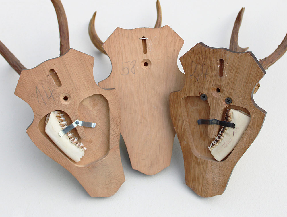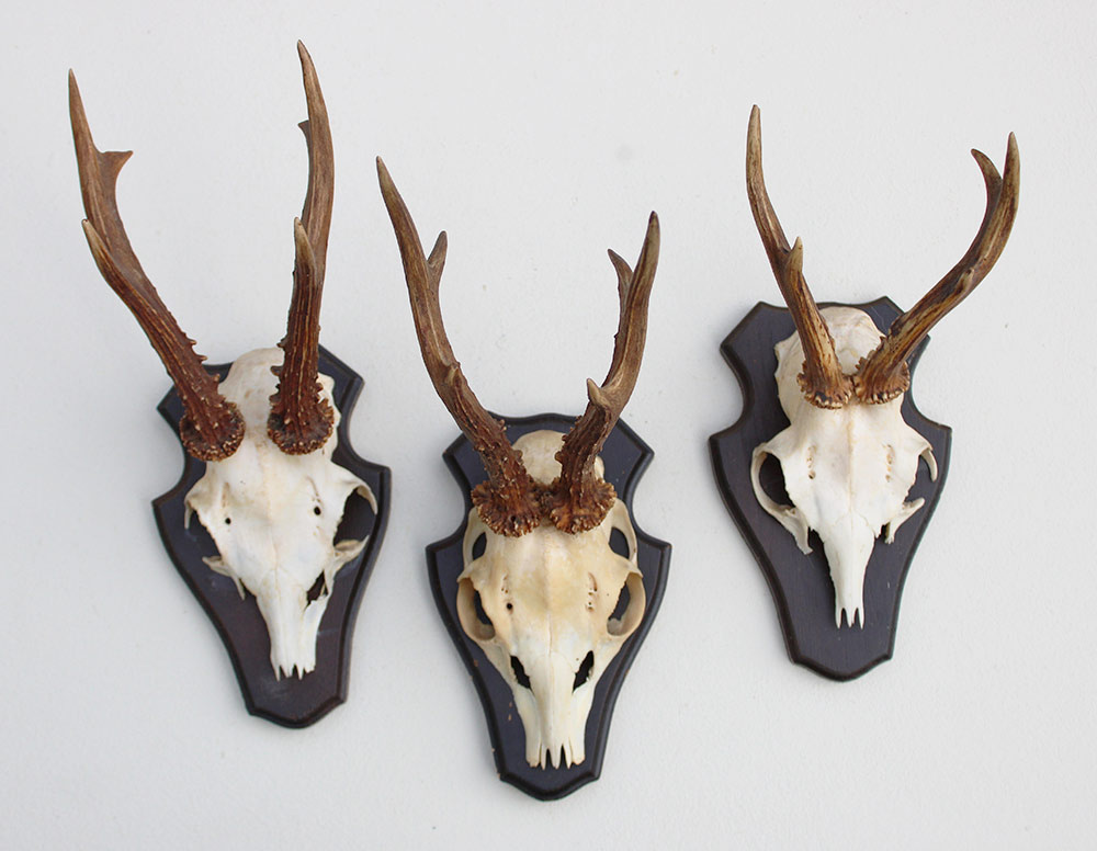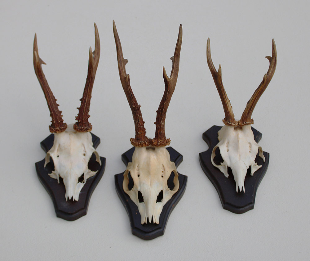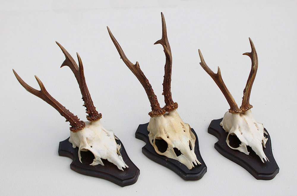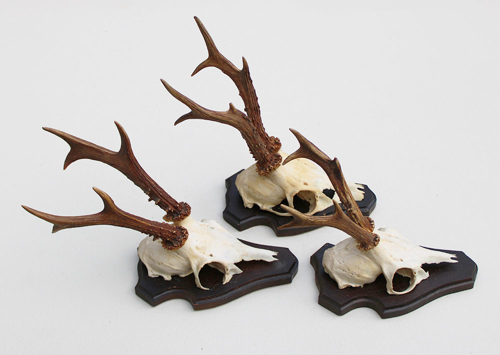 3 x REE GEWEI op houten schild. Decoratieve set - de stanglengte bedraagt 15-19 cm. Aan de achterzijde deels voorzien van de kaakdeeltjes.