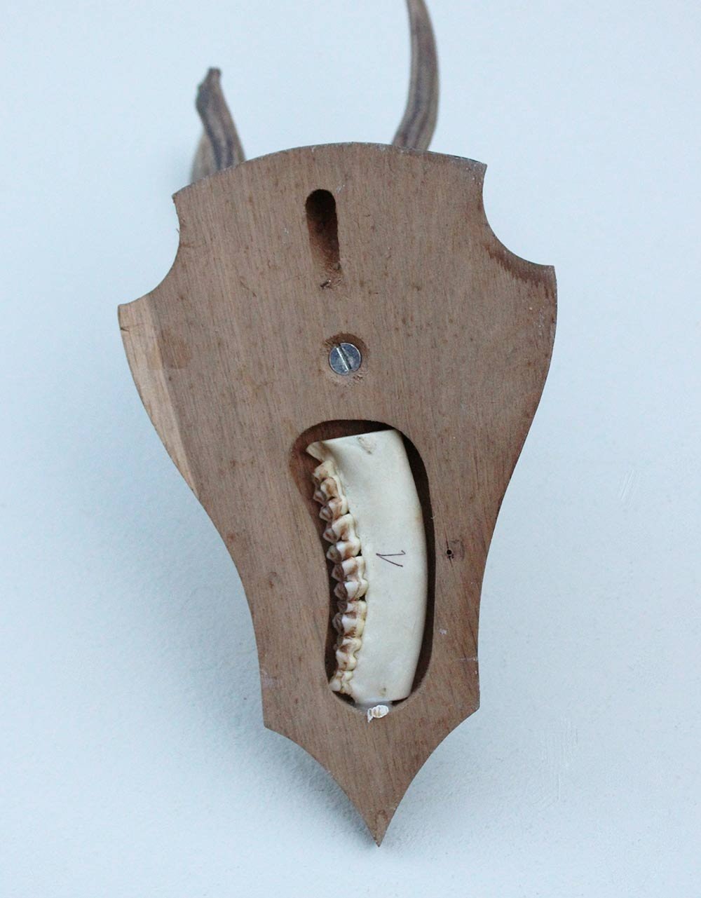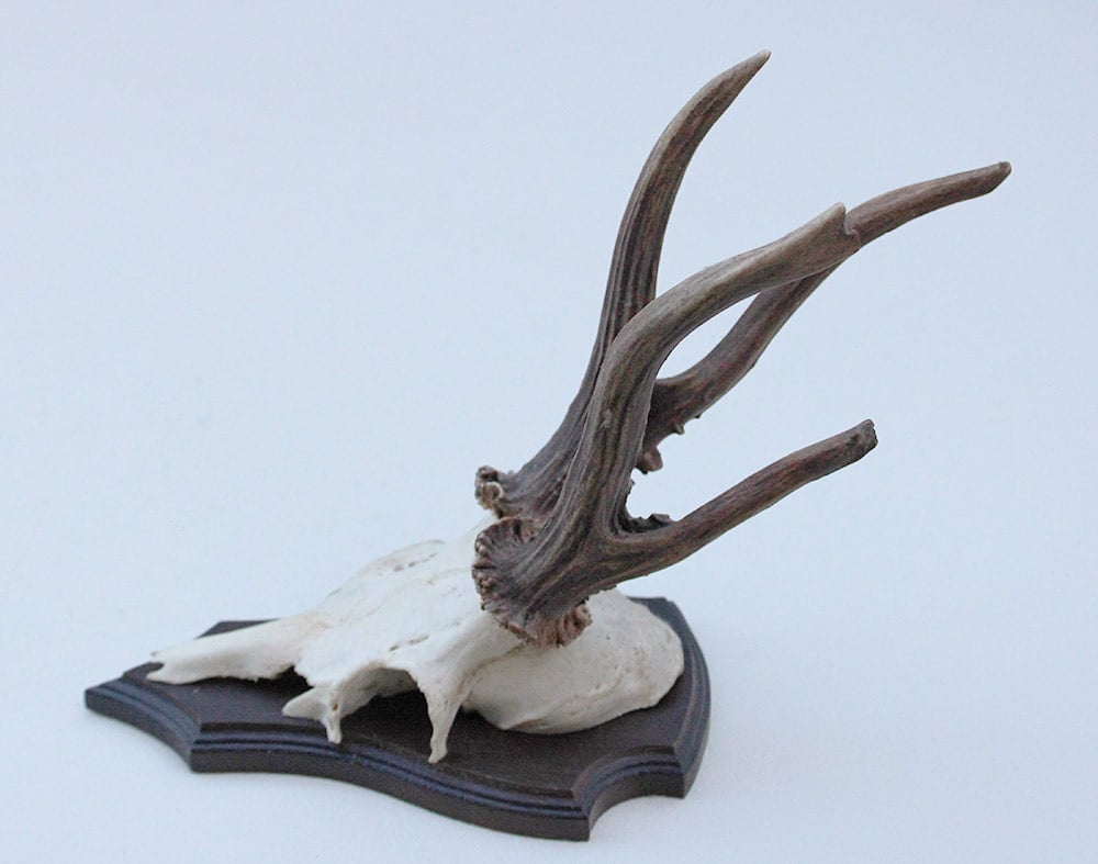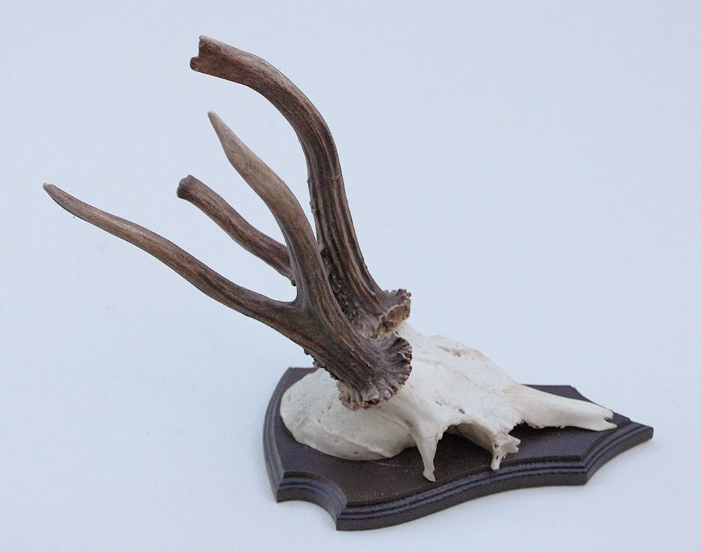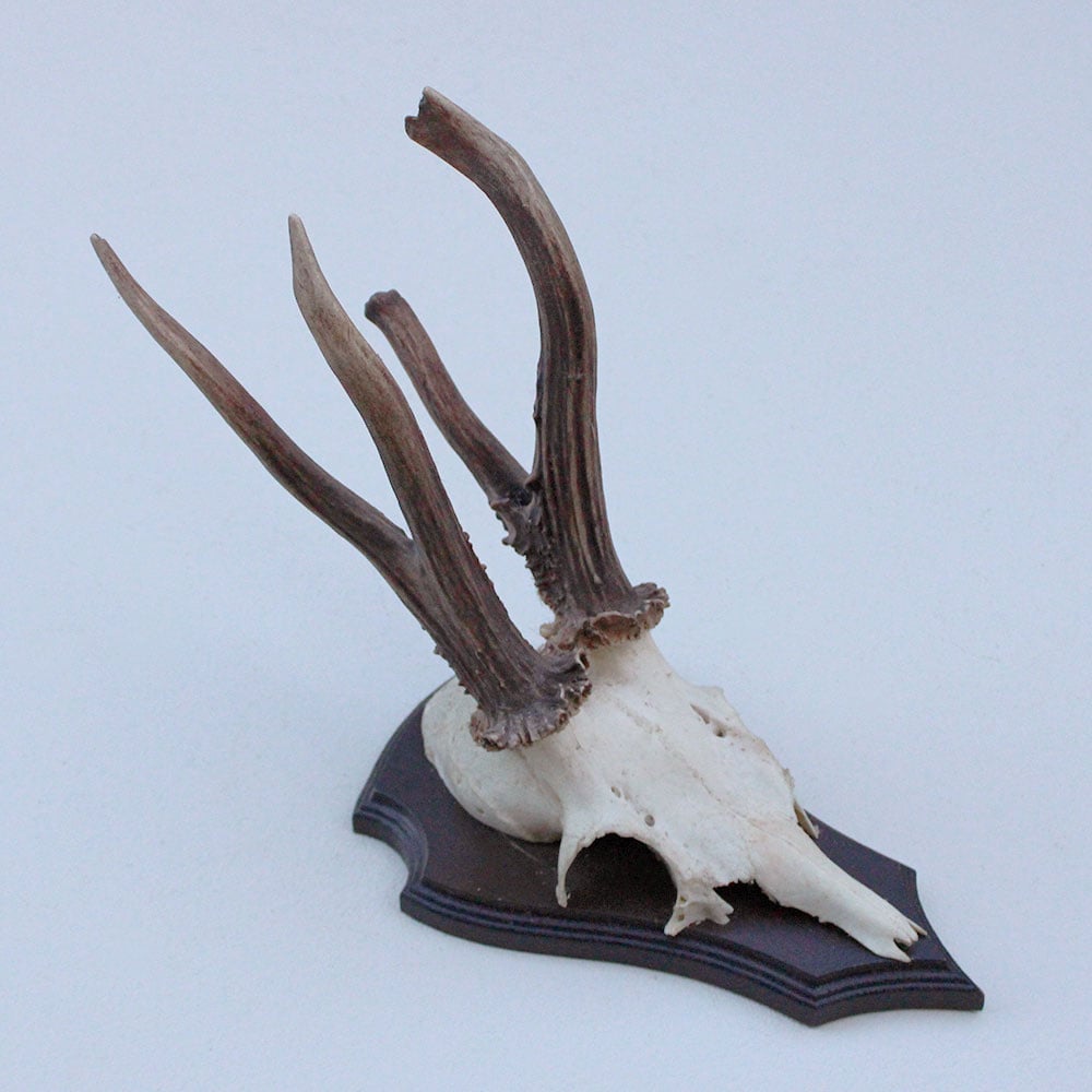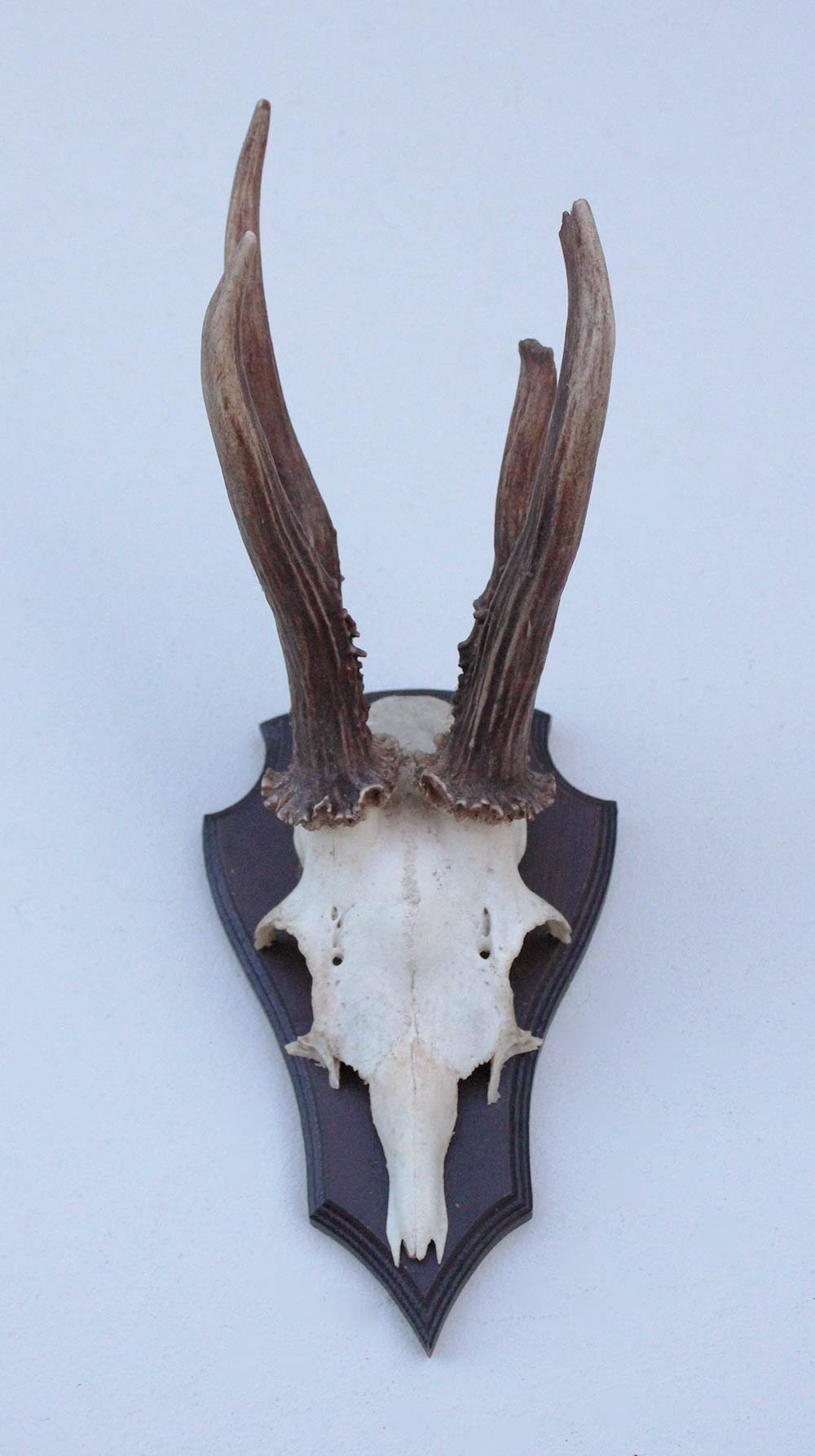 Abnorm REE GEWEI op houten schild. De stanglengte bedraagt 17 cm.