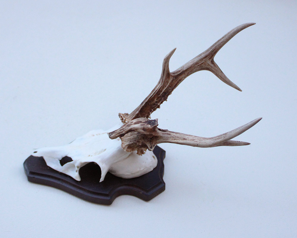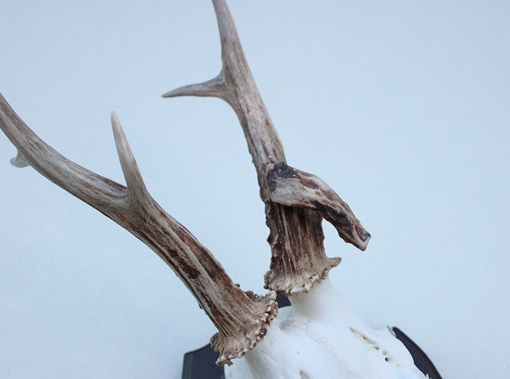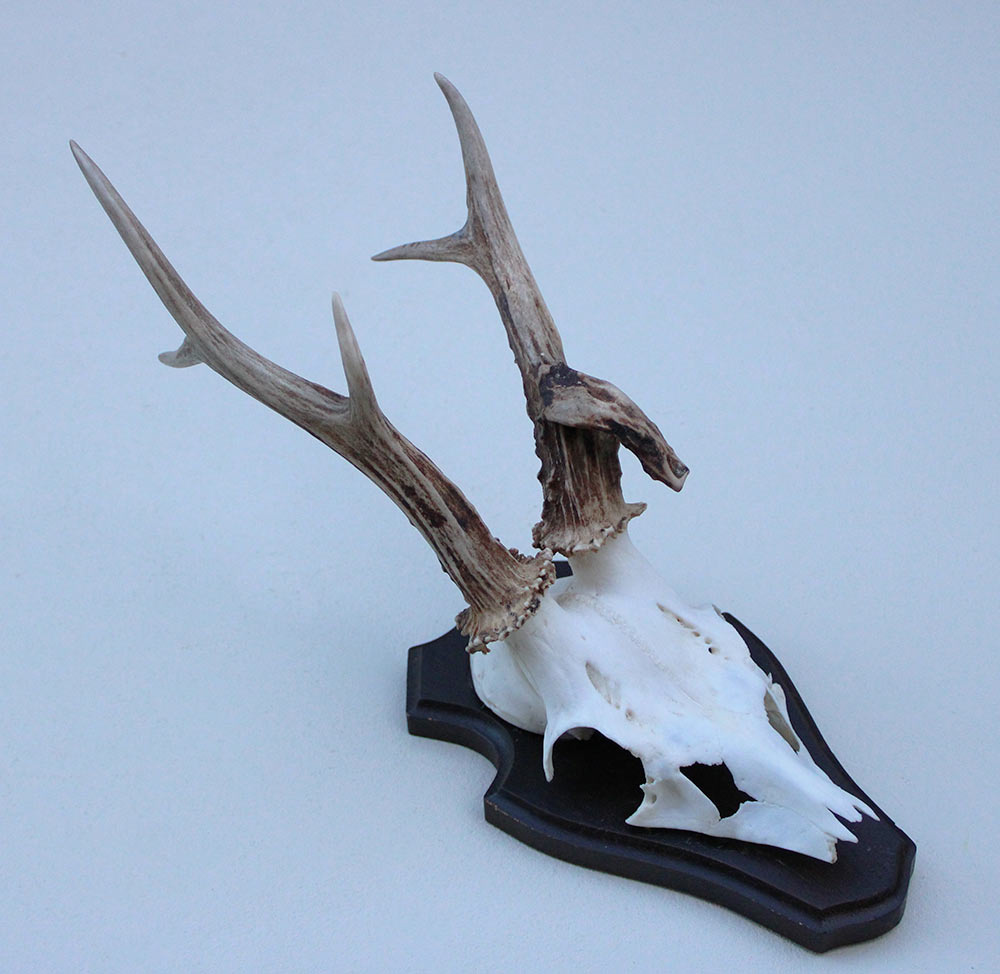 Abnorm zesender REE GEWEI op houten schild. De stanglengte bedraagt 19/21 cm.