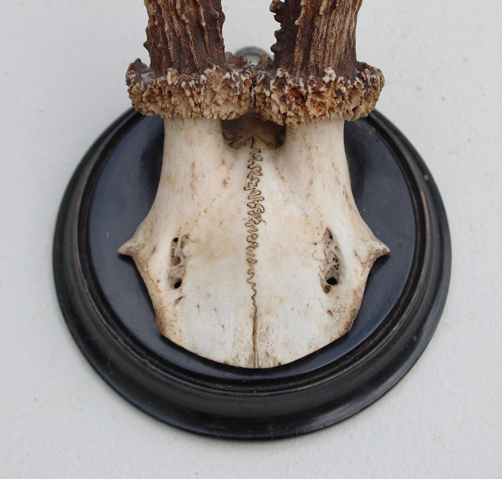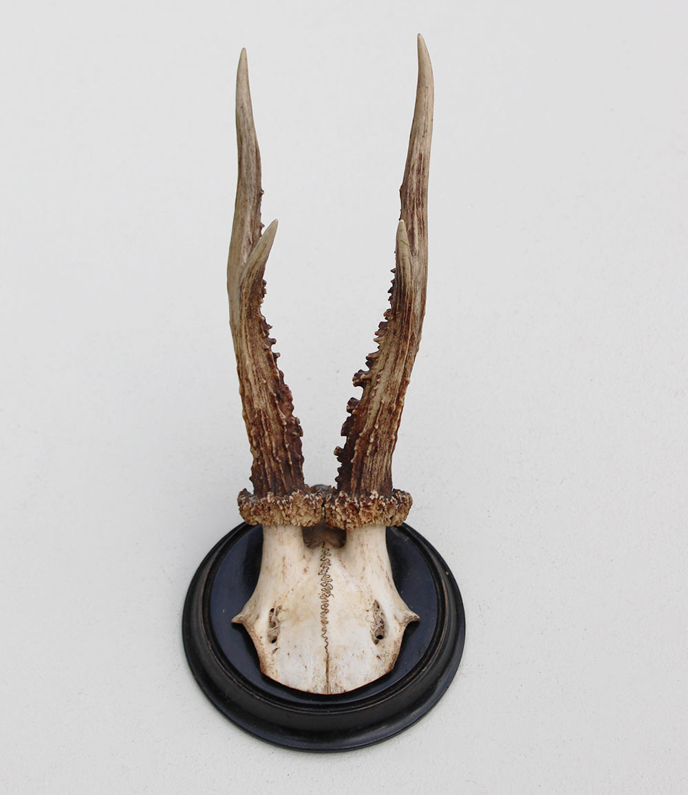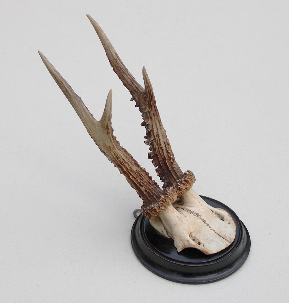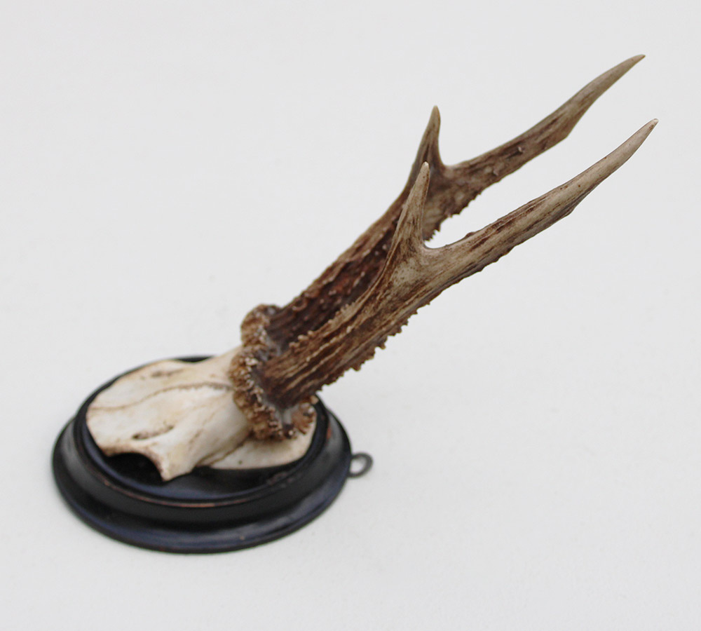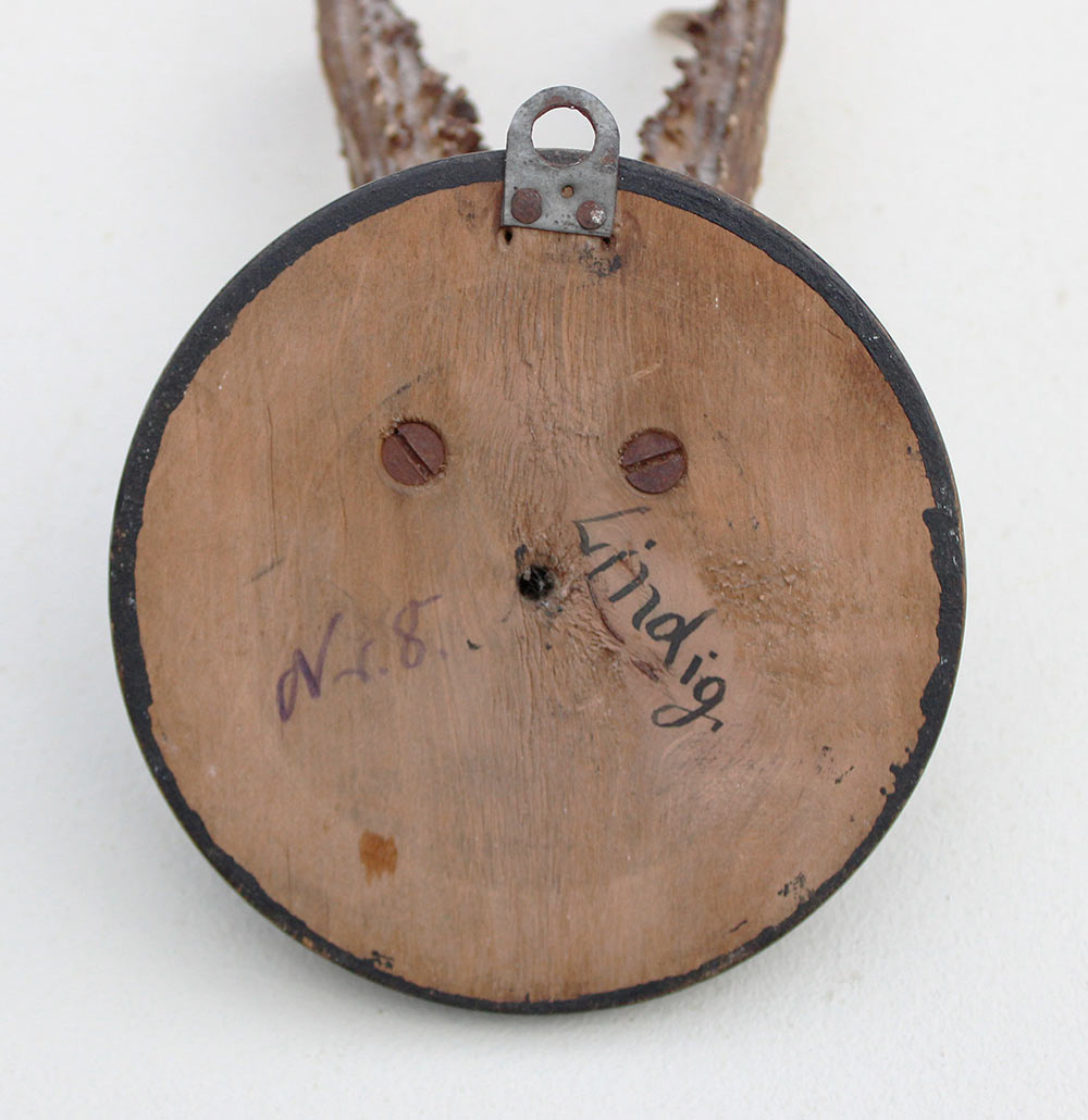 Antiek REE GEWEI op rond zwart houten schild - rond 1910. Diameter schild 12 cm. De stanglengte bedraagt 19 cm.