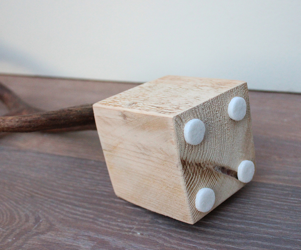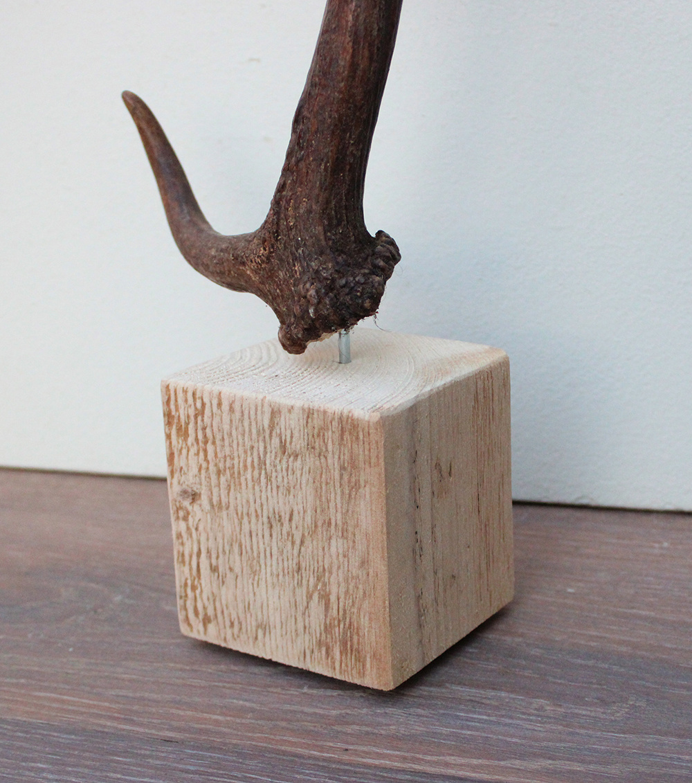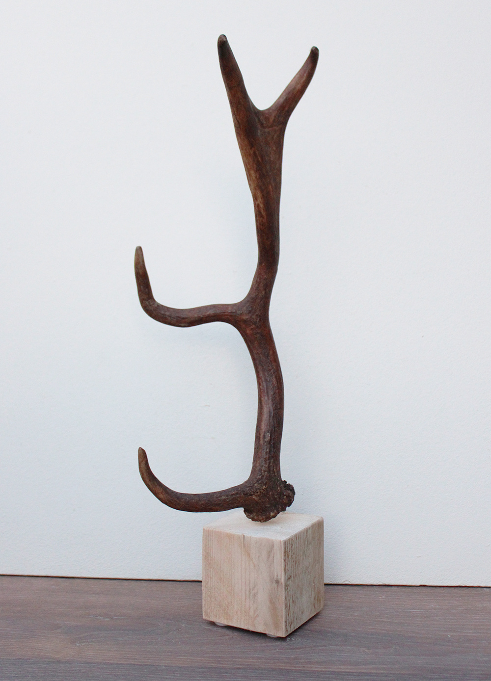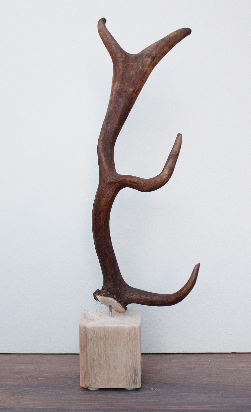 DAMHERT GEWEI - op houten sokkel (9 x 9 x 10). Lengte geweistang 45 cm, totale hoogte bedraagt 57 cm.