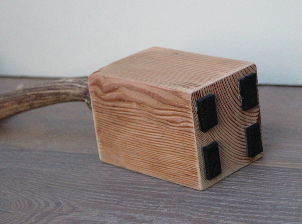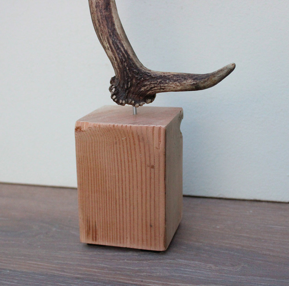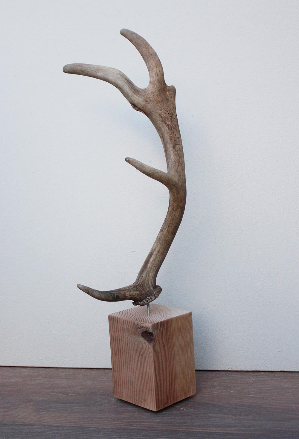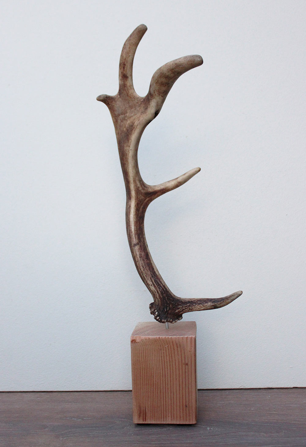 DAMHERT GEWEI - op houten sokkel (9 x 9 x 12,5 cm). Lengte geweistang 40 cm, totale hoogte bedraagt 55 cm.