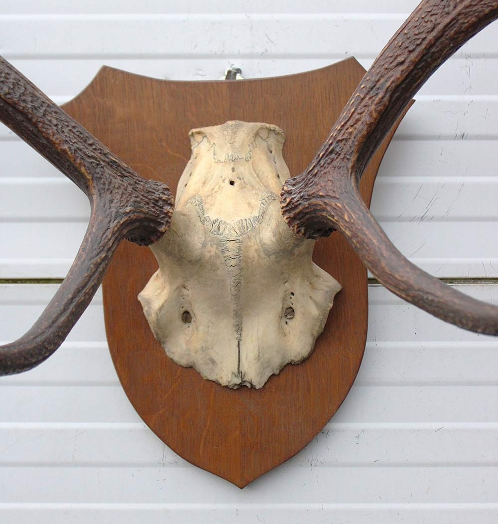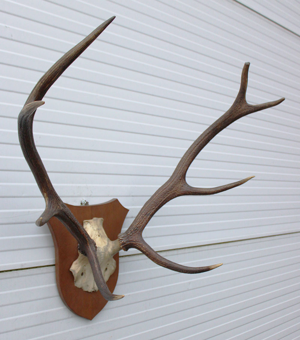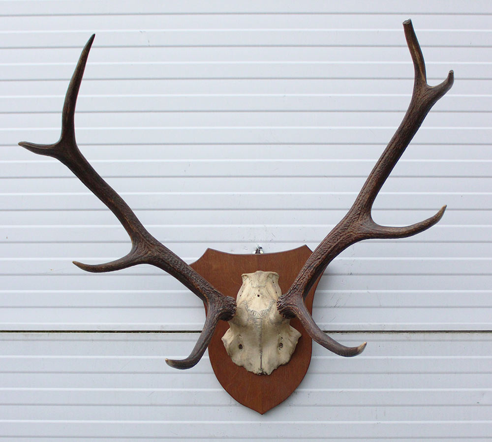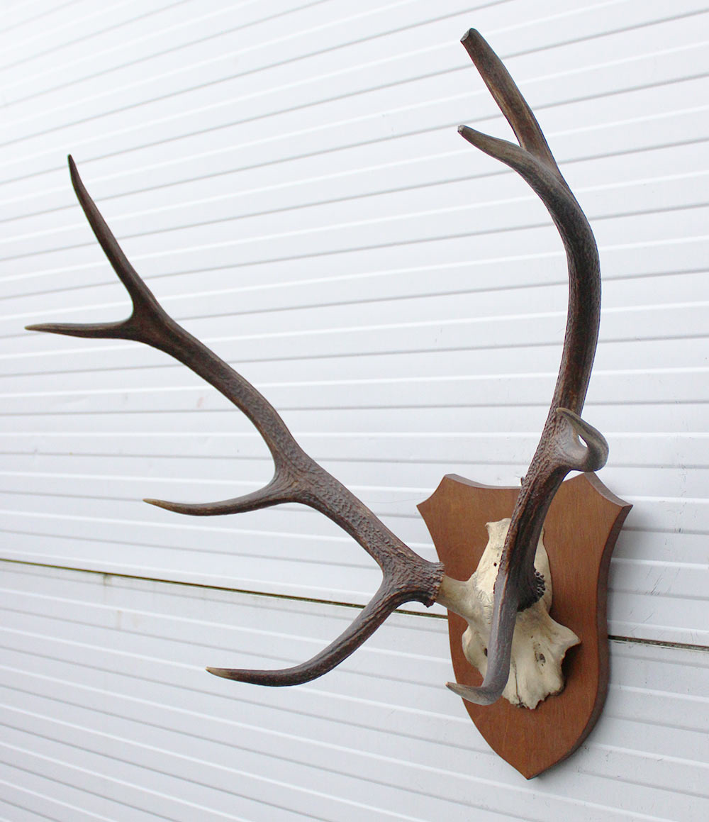 30er jaren EDELHERT GEWEI 8-ender op eikenhouten schild (34 x 29 cm). Lengte van de geweistangen bedraagt 65 cm, het gewei is 69 cm breed. De totale hoogte is ± 70 cm, diepte 47 cm. Lengte oogeind 27 cm.