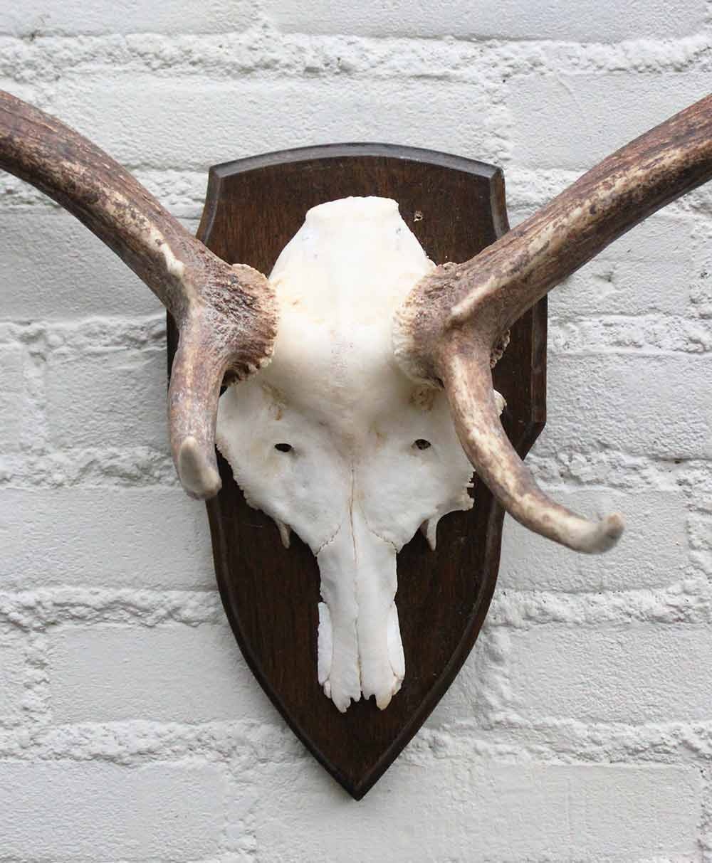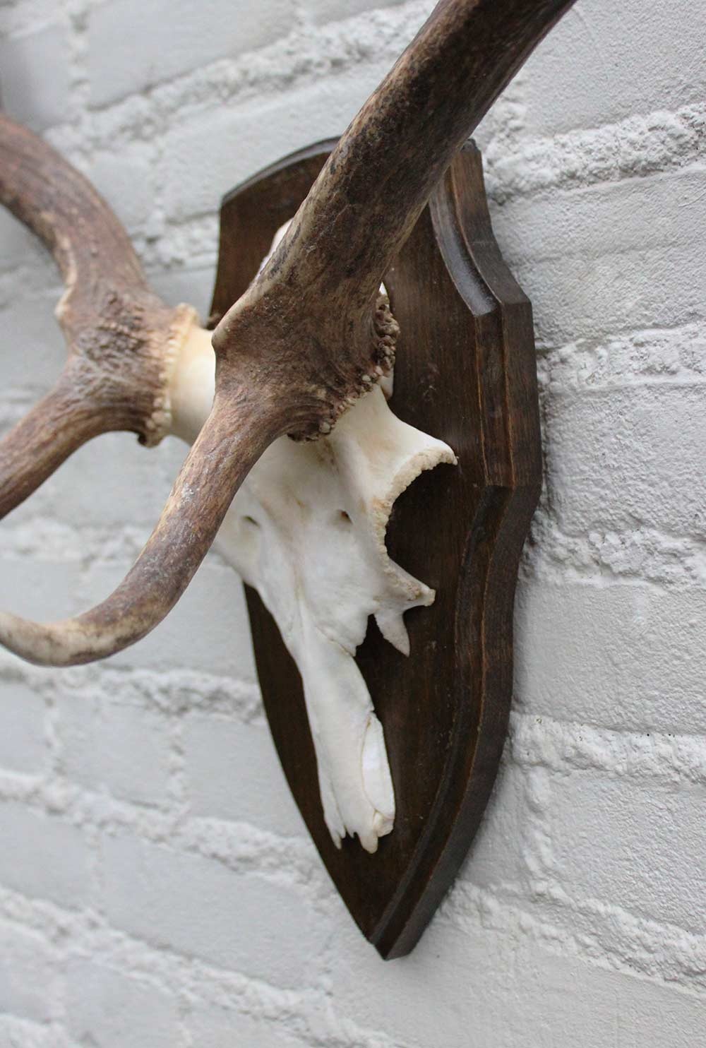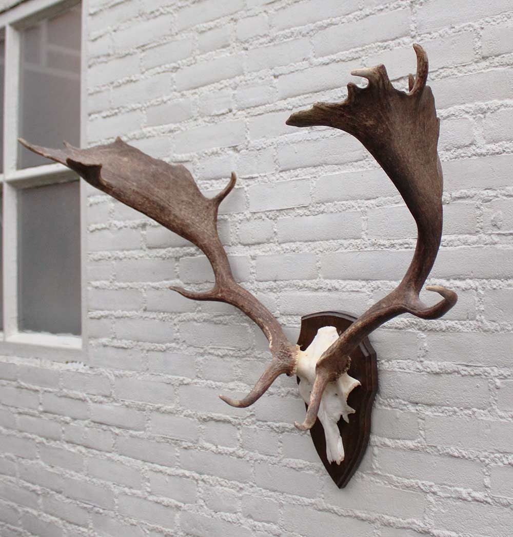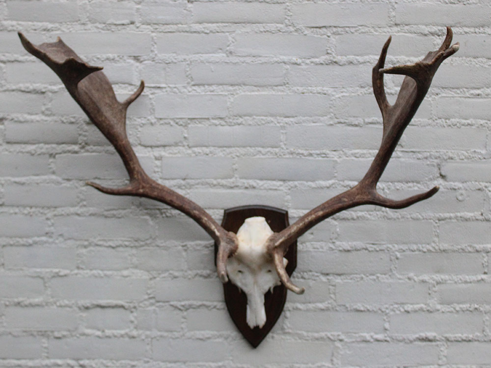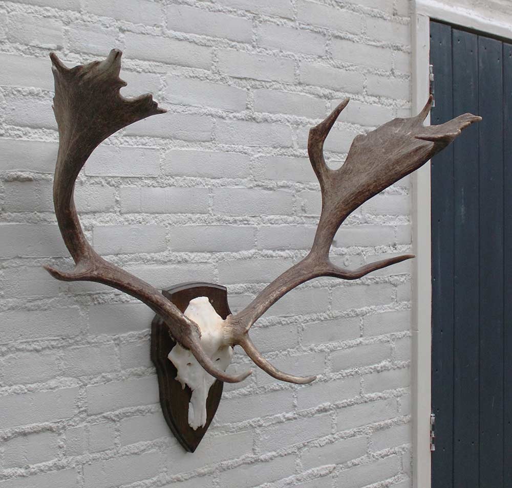 Groot DAMHERT GEWEI op houten schild. De lengte van de geweistangen bedraagt 70 cm. Het stuk is 78 cm breed, 61 cm hoog en 38 cm diep. Breedte schoffels 13 cm.