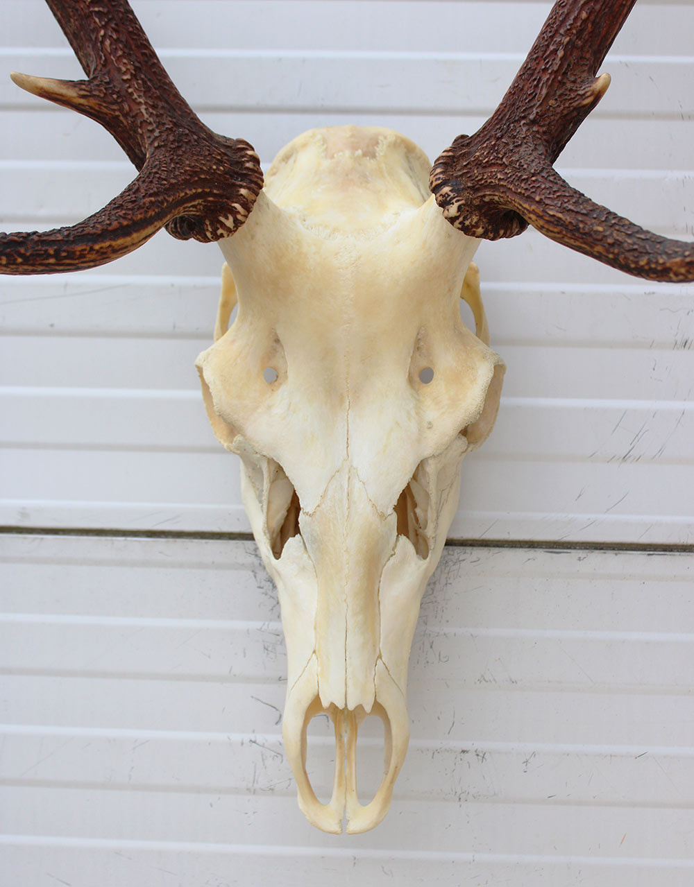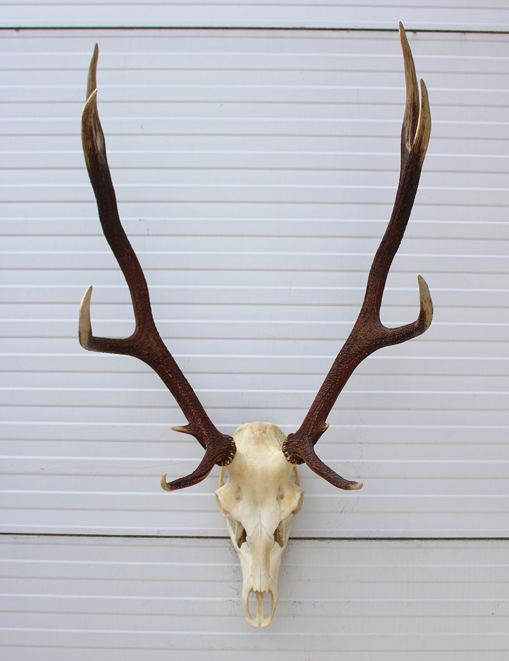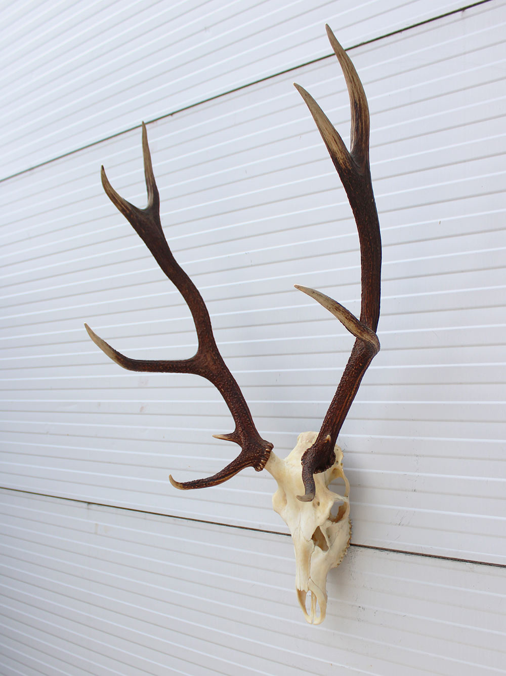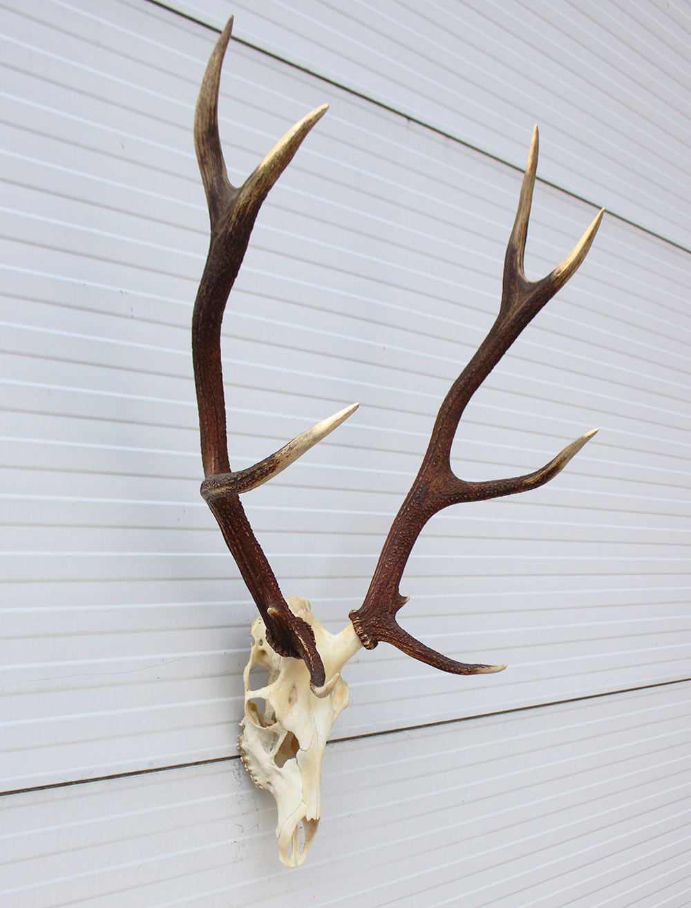 Groot EDELHERT GEWEI 10-ender compleet met kiezen. Lengte van de geweistangen bedraagt 72 cm, het gewei is 55 cm breed. De totale hoogte is 103 cm, diepte 40 cm. Lengte oogeind 19 cm.