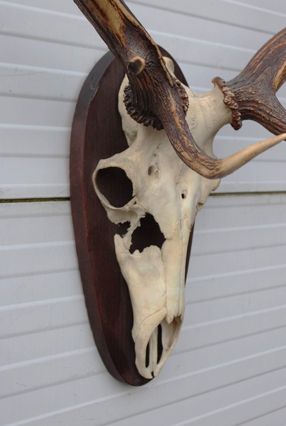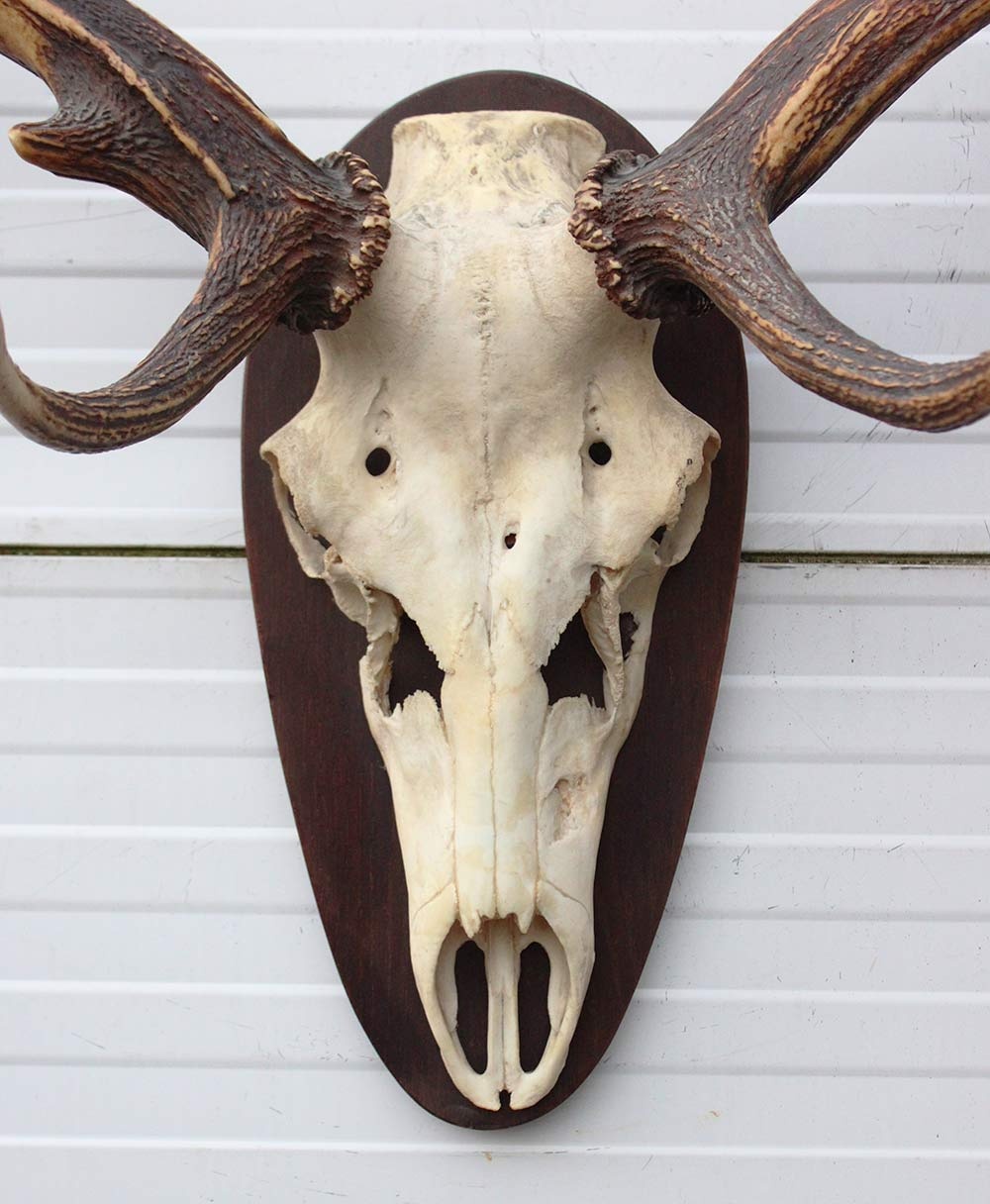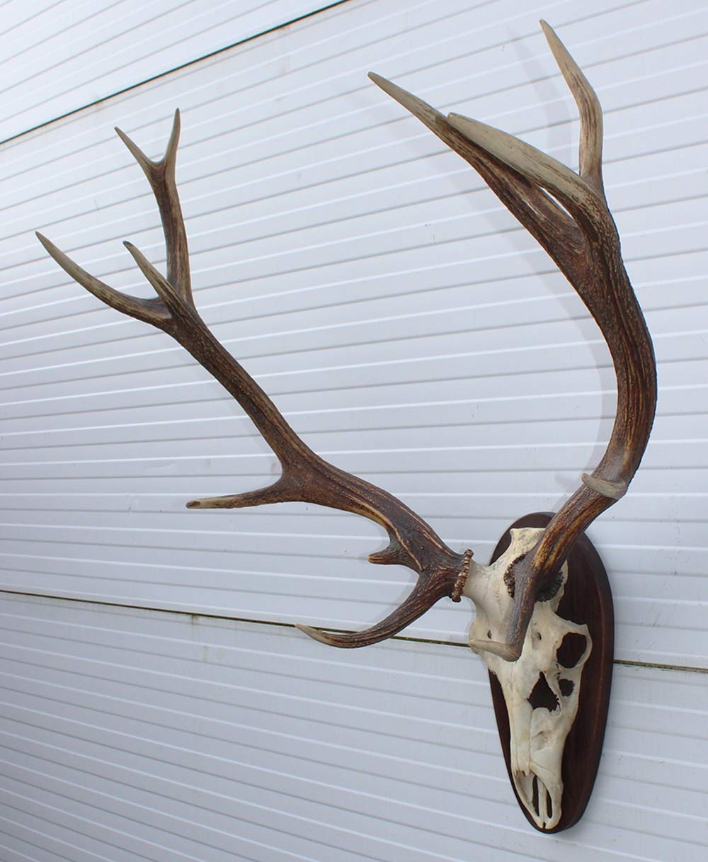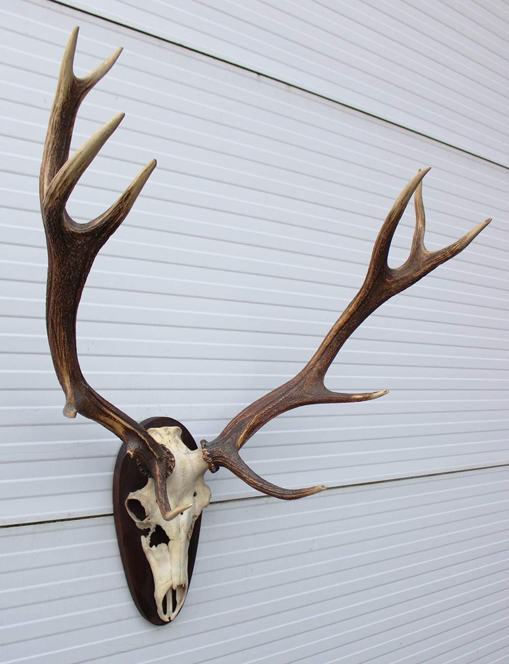 Groot EDELHERT GEWEI, ongelijke 14-ender op solide houten schild. Lengte van de geweistangen bedraagt 80 cm, het gewei is 81 cm breed. De totale hoogte is ± 100 cm, diepte 51 cm. Lengte oogeind 25 cm.