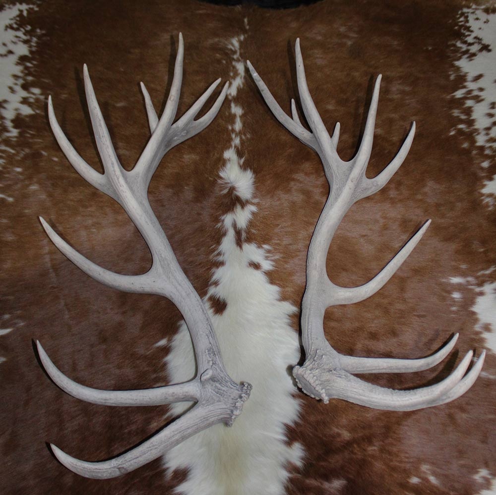 Groot paar EDELHERT GEWEI AFWERPSTANGEN - 20-ender - 6 kg - 95 cm. Ter decoratie of verdere verwerking. Onbehandeld. Met boenwas makkelijk donkerder/dieper te kleuren.