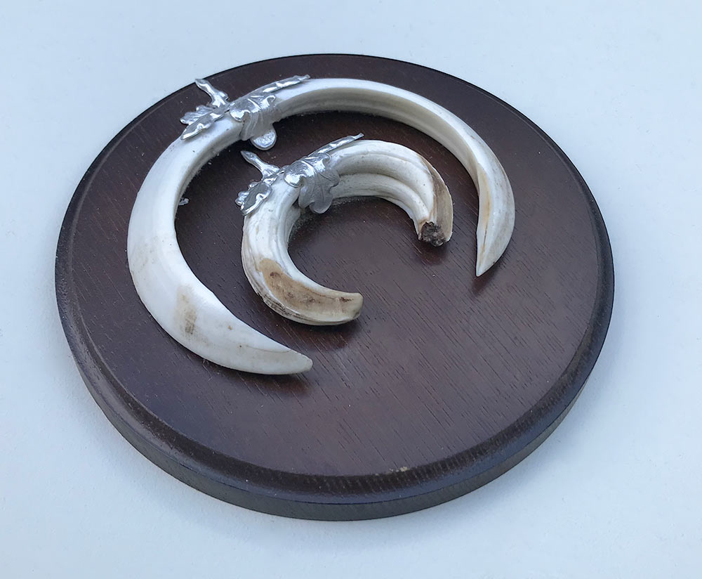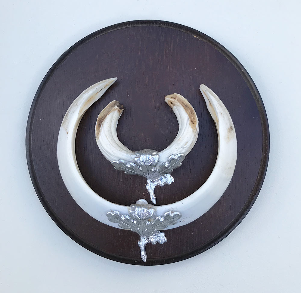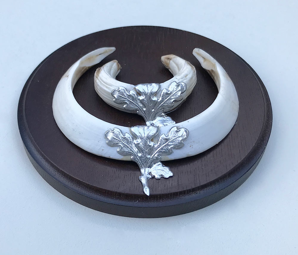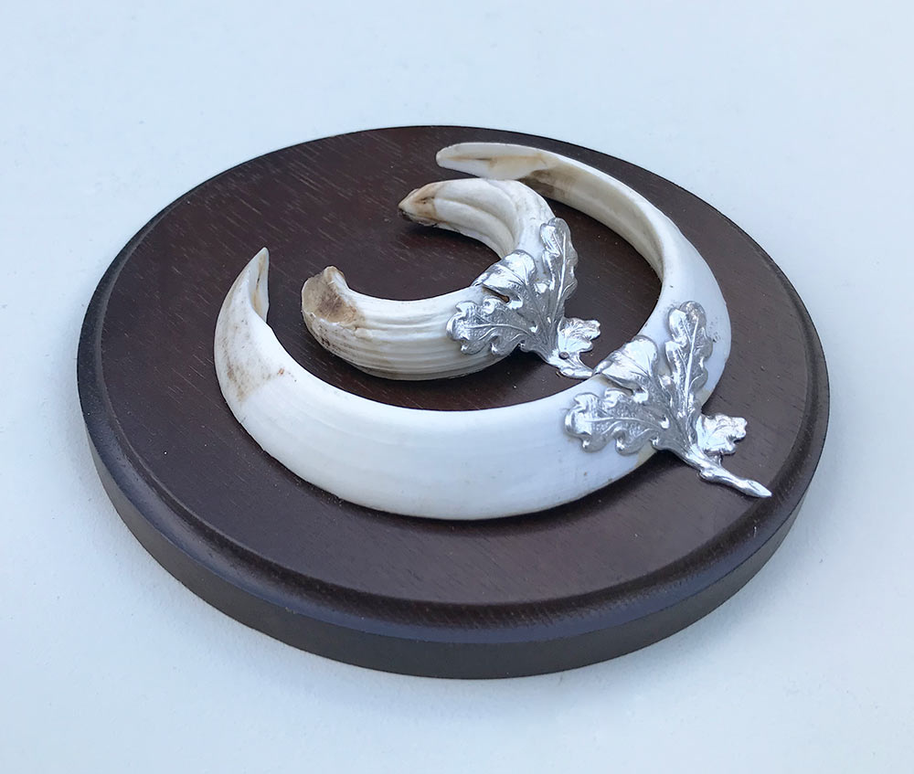 Groot schild tanden EVERZWIJN / WILD ZWIJN afgewerkt met aluminium loof bladeren. Schilddiameter 18 cm. Lengte tanden 16/7 cm.