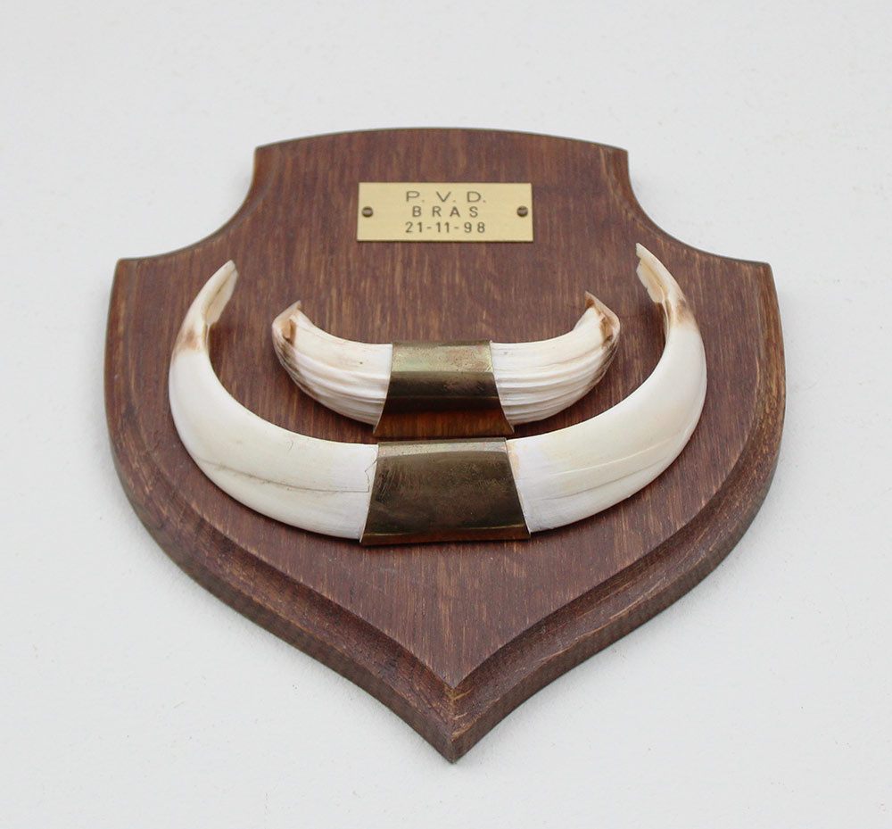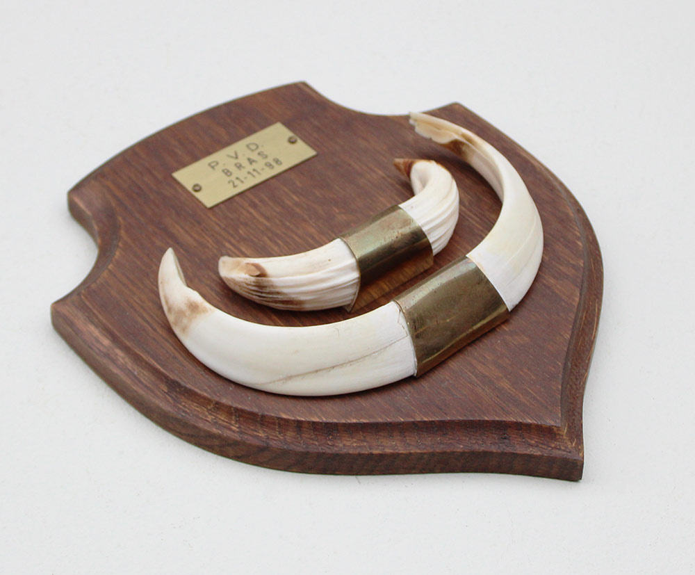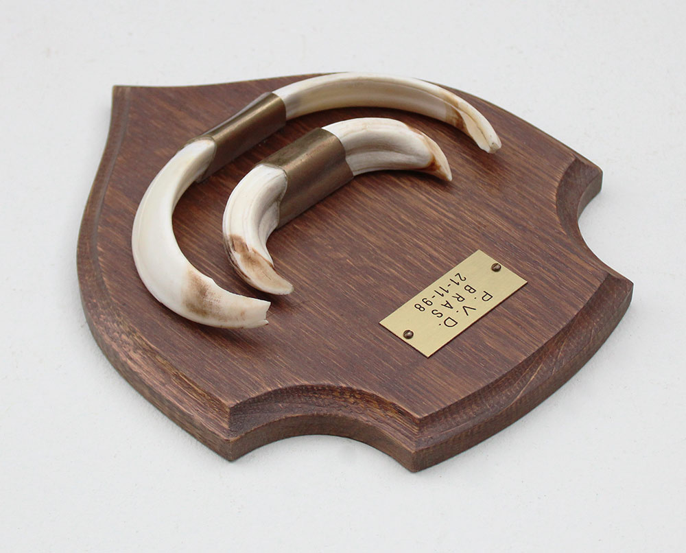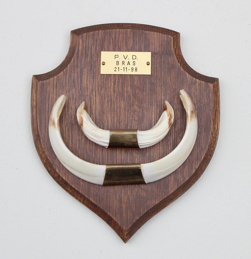 Groot schild tanden EVERZWIJN / WILD ZWIJN afgewerkt met koper. Afmeting schild 20 x 17 cm. Lengte tanden 11/5 cm. Afkomstig uit de Belgische Ardennen.