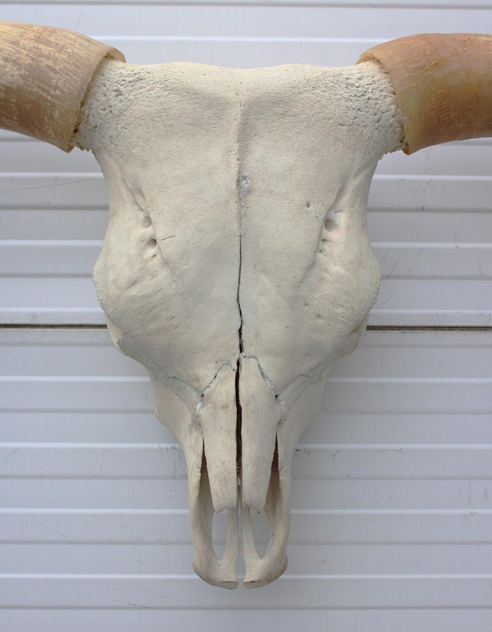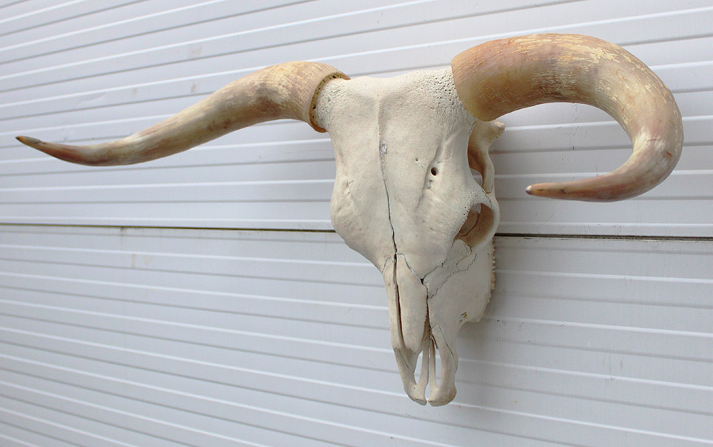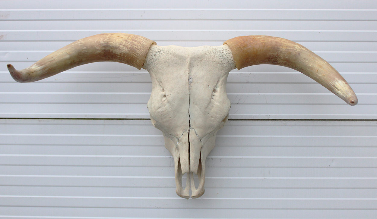 Grote schedel HIGHLANDER RUND. Het stuk is 87 cm breed, 45 cm diep en 50 cm hoog.