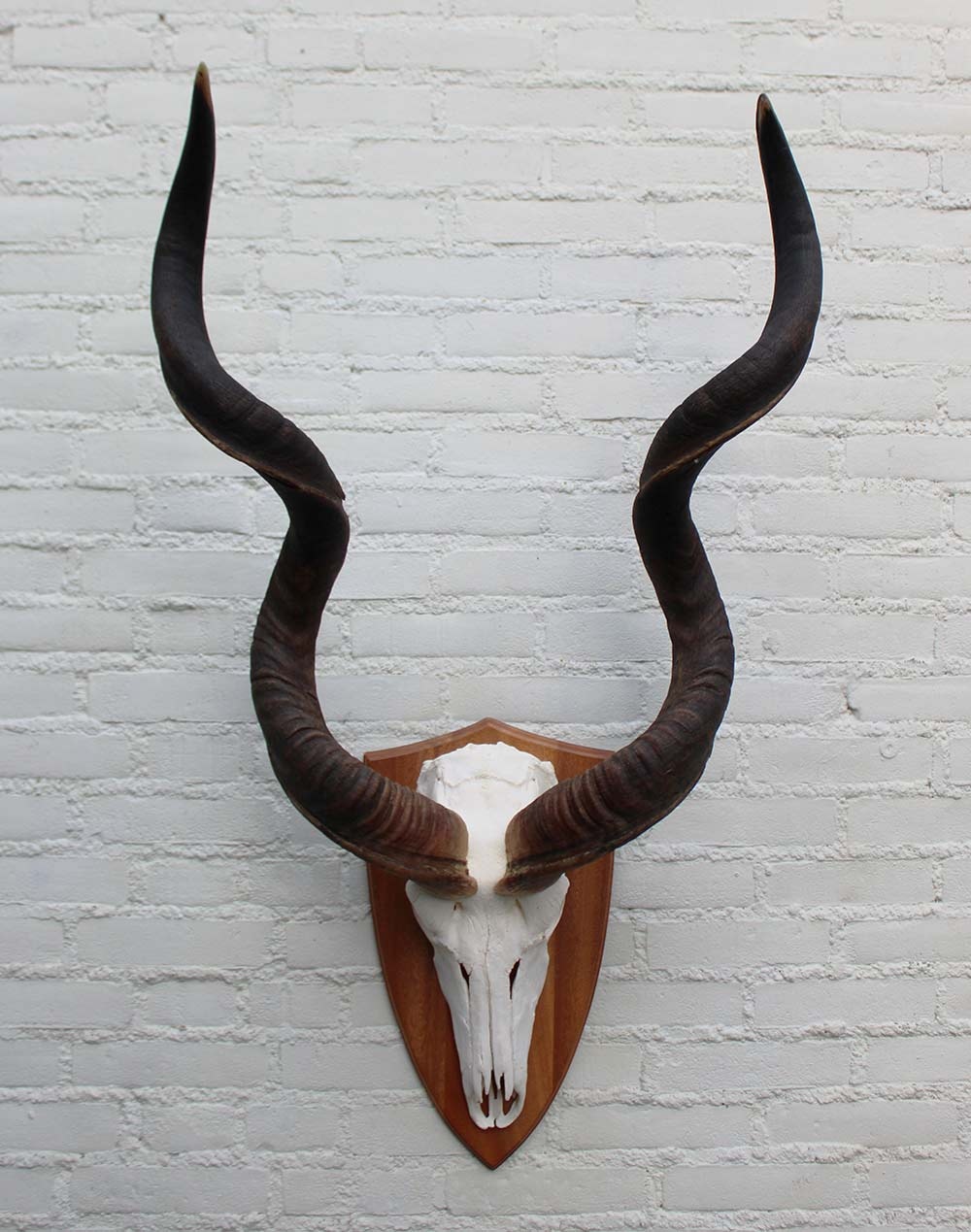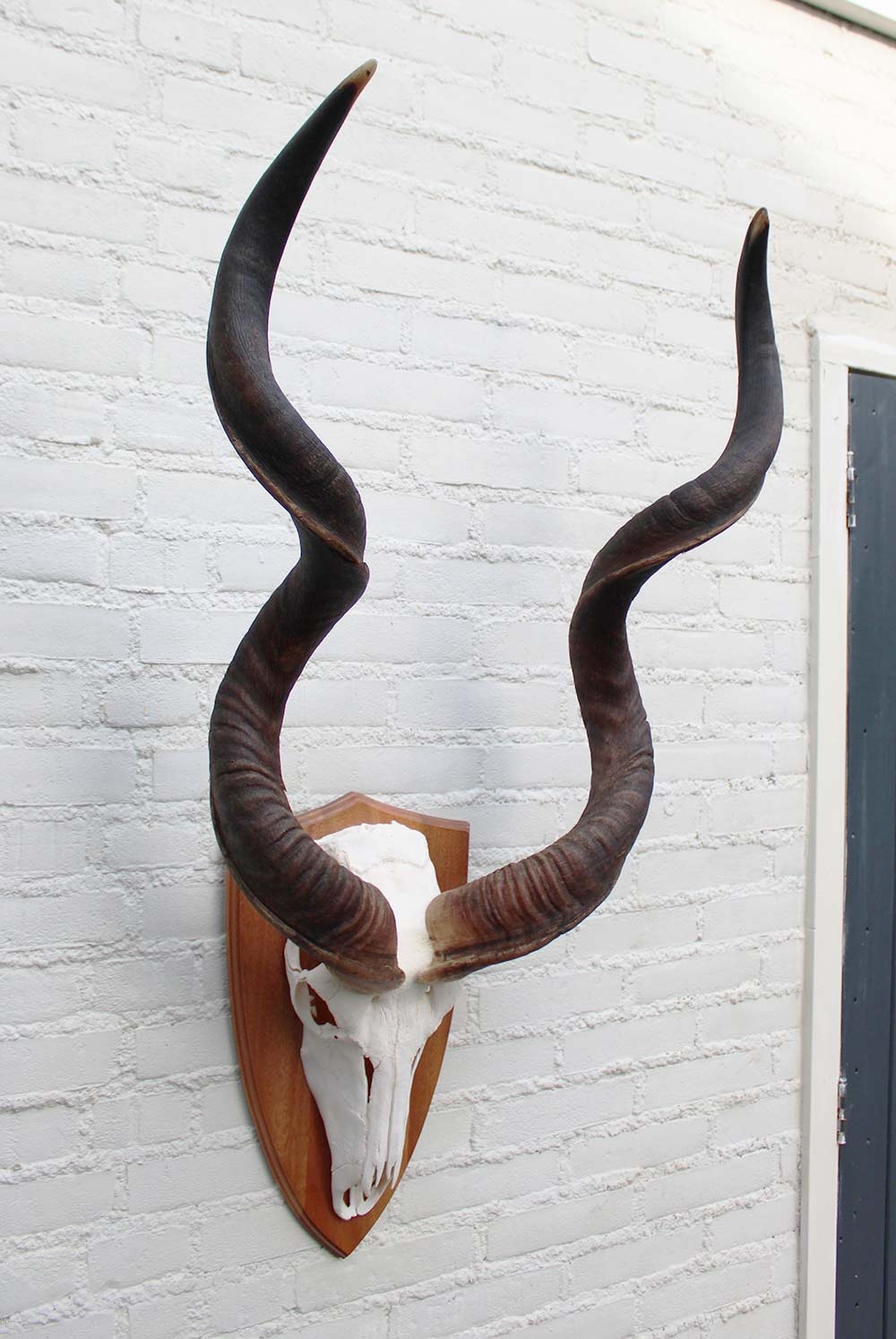 Grote schedel KUDU ANTILOPE op houten schild. De lengte van de afneembare hoorns in een rechte lijn gemeten bedraagt 88 cm. Het stuk is 85 cm breed, 100 cm hoog en 41 cm diep.