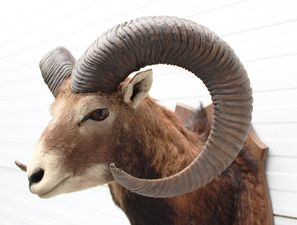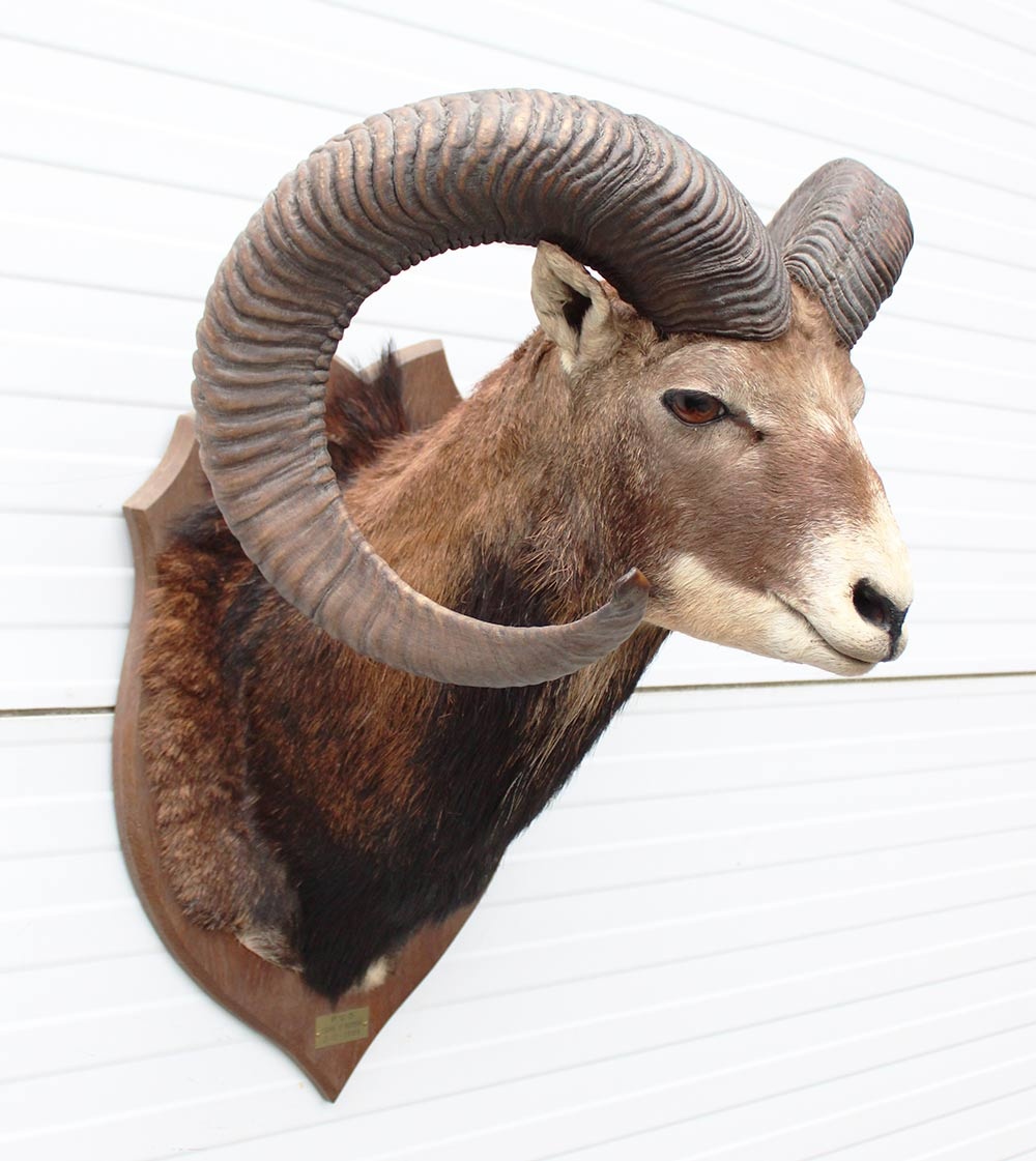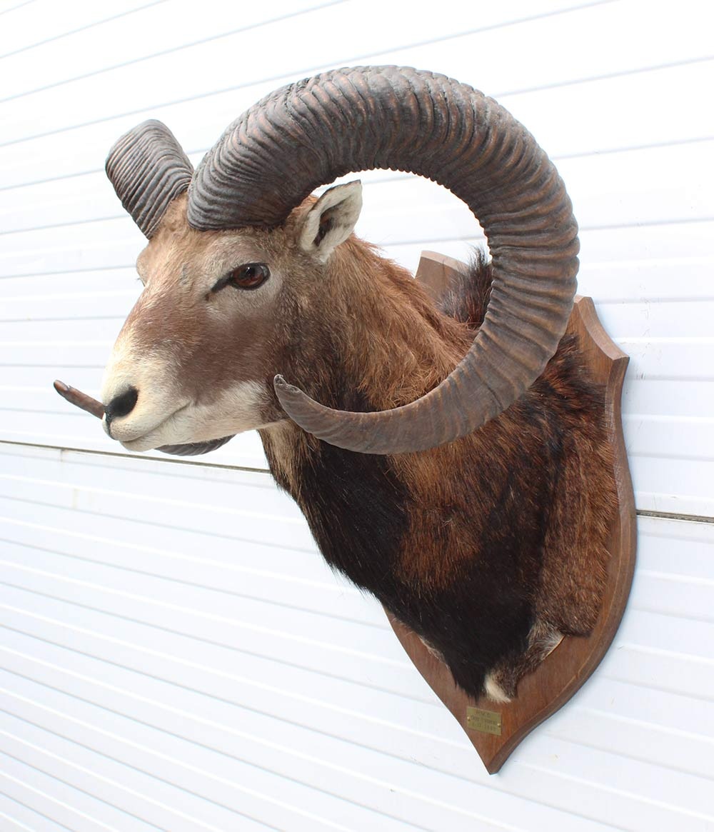 Grote opgezette KOP MOEFLON RAM op houten schild. De lengte van de hoorns bedraagt 83 cm. Dit preparaat is 62 cm hoog en 46 cm breed. De diepte (puntje neus - muur) bedraagt 44 cm. Afkomstig uit de Belgische Ardennen.