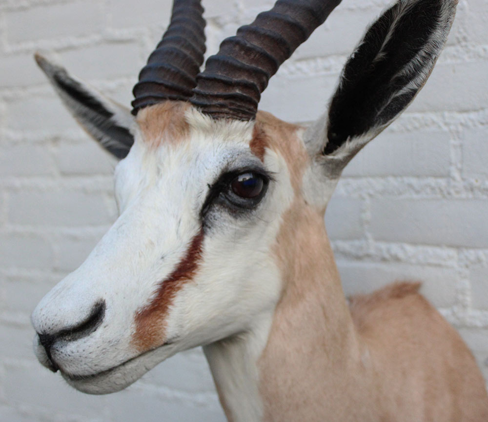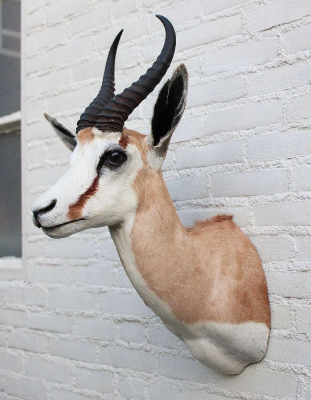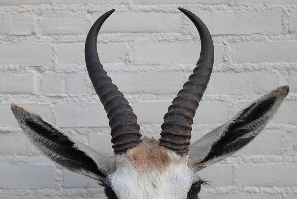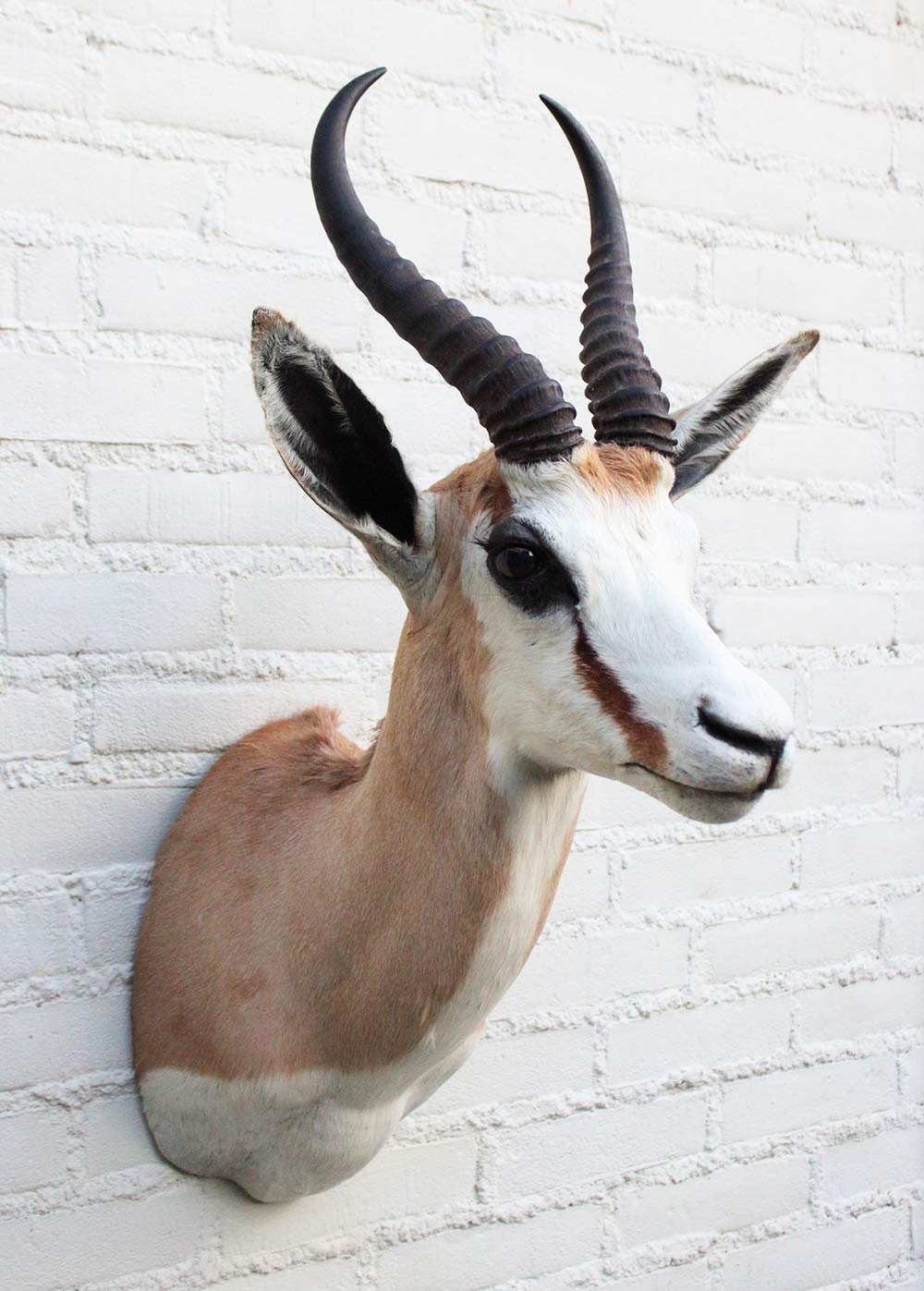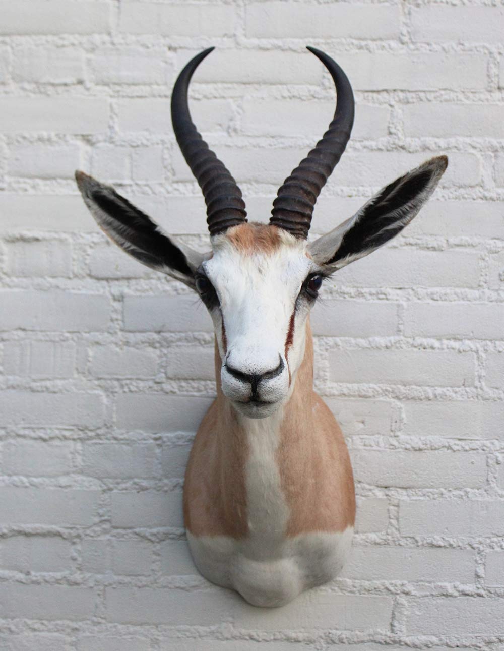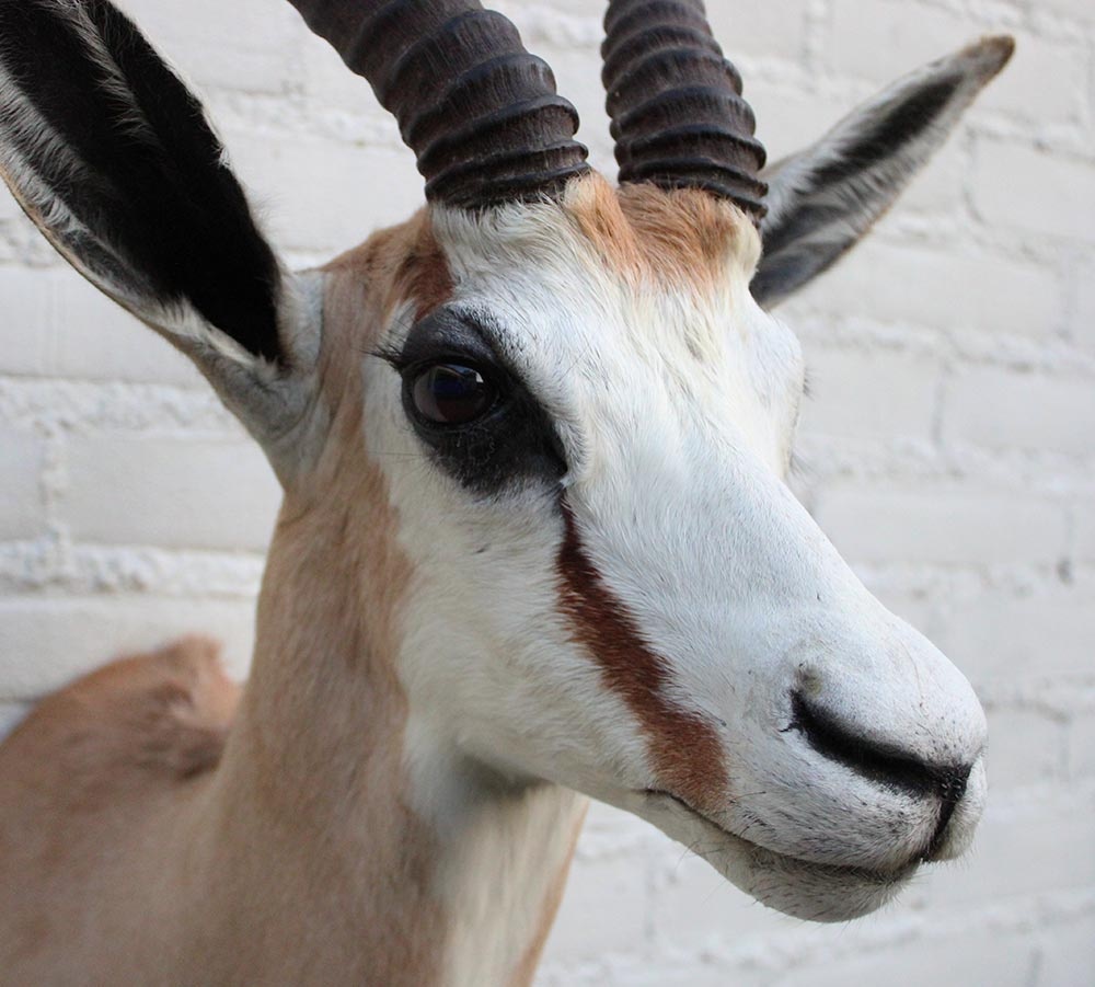 Opgezette KOP SPRINGBOK antilope. De lengte van de hoorns bedraagt 31 cm. Dit preparaat is 70 cm hoog, 45 cm diep en 40 cm breed.