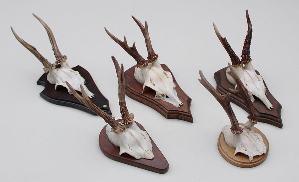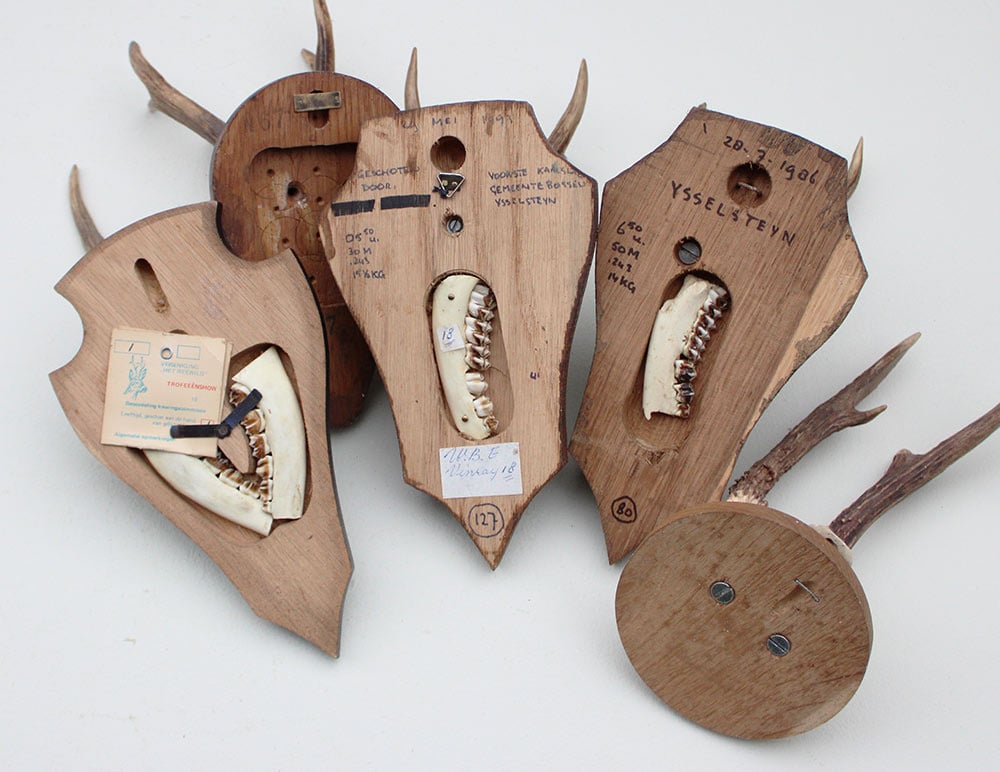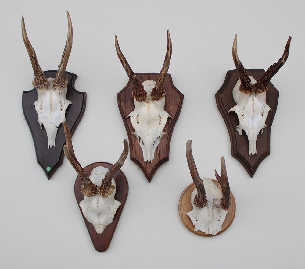 OPRUIMING: 5 x REE GEWEI op houten schild - aan de achterzijde deels voorzien van kaakdeeltje. Decoratieve set!