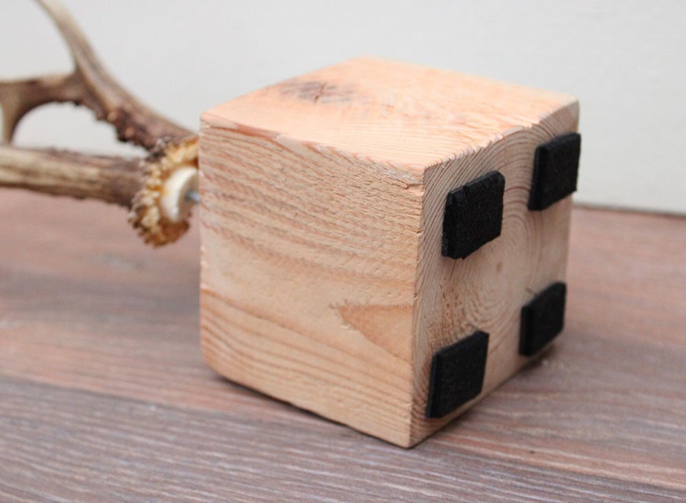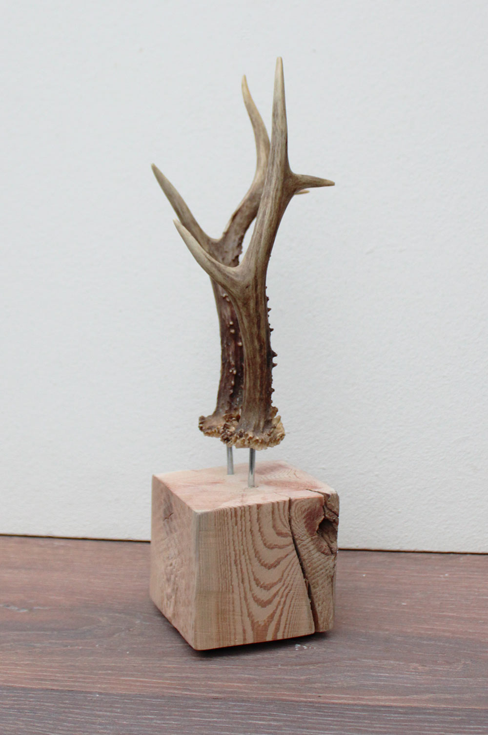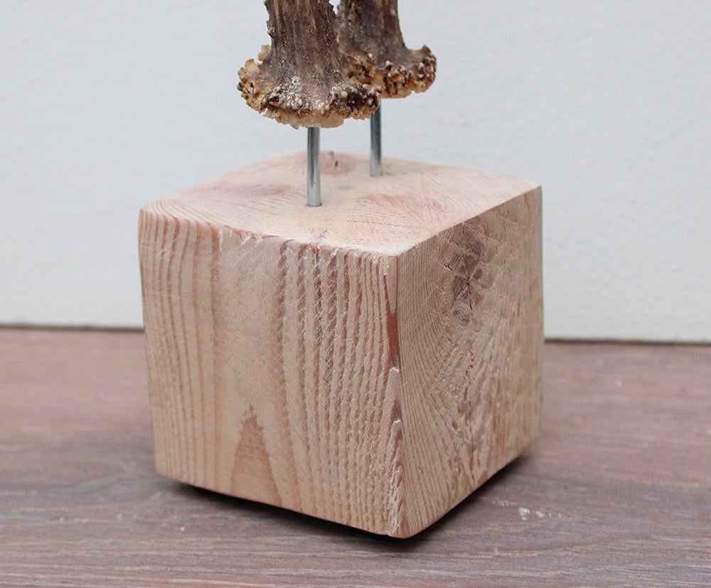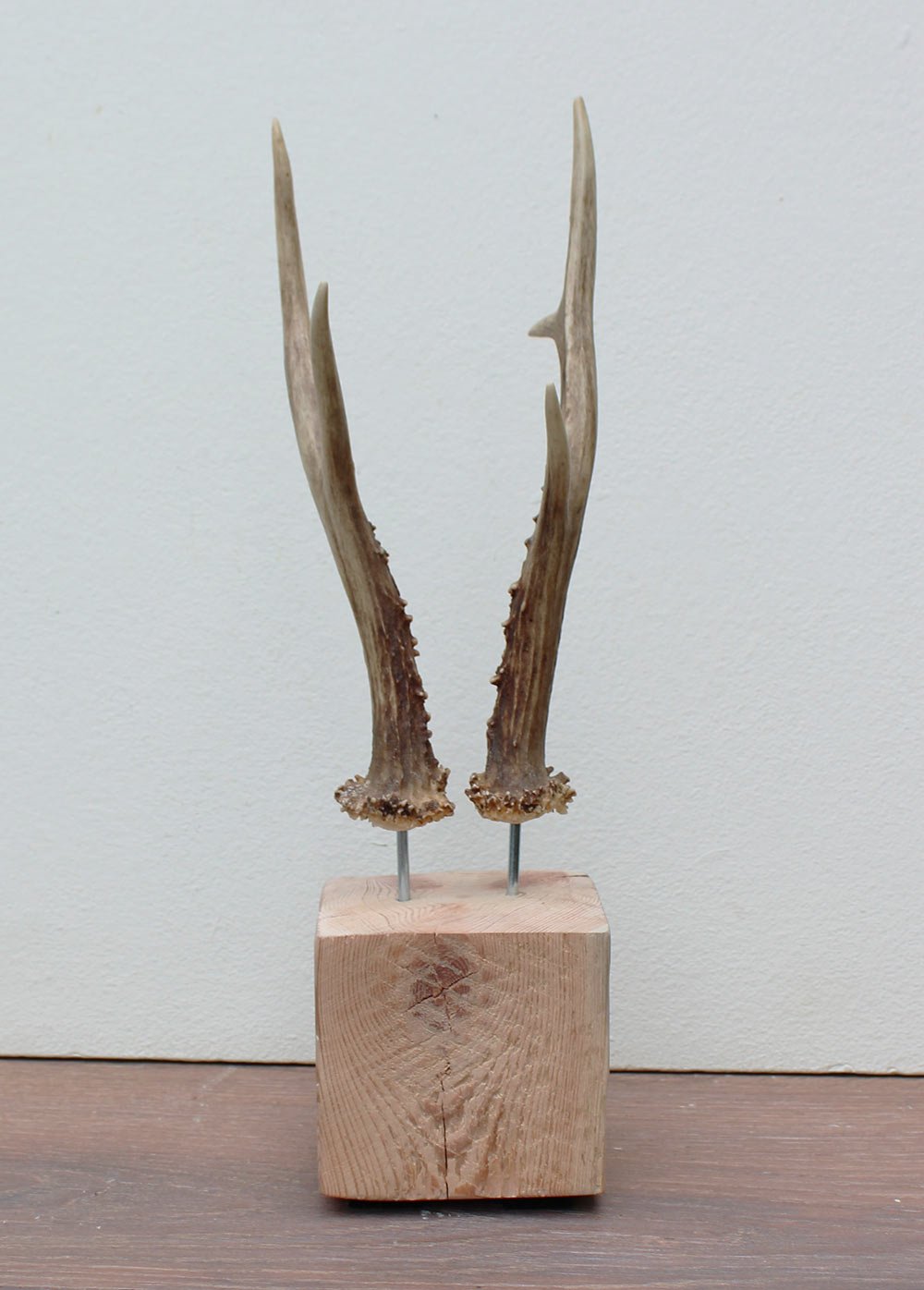 Paar zesender GEWEISTANGEN REEBOK op stevige houten sokkel (9 x 9 x 9 cm). Lengte geweistangen 23 cm. Totale hoogte bedraagt 35 cm.