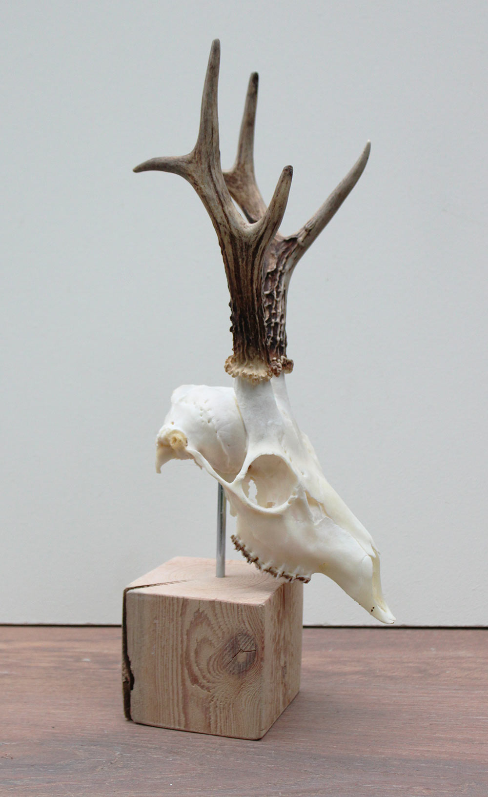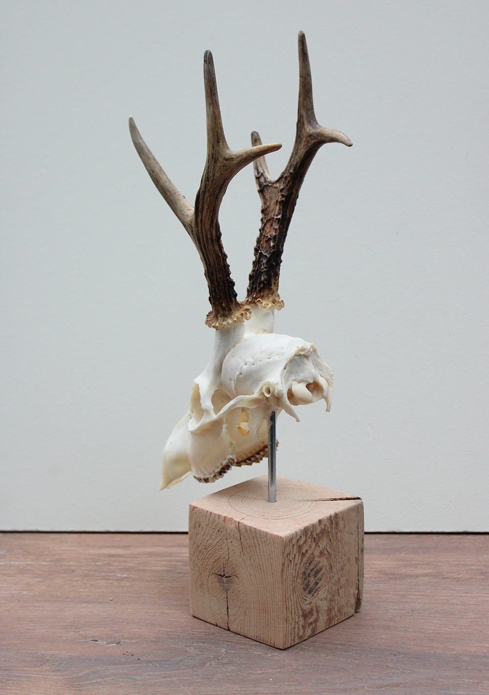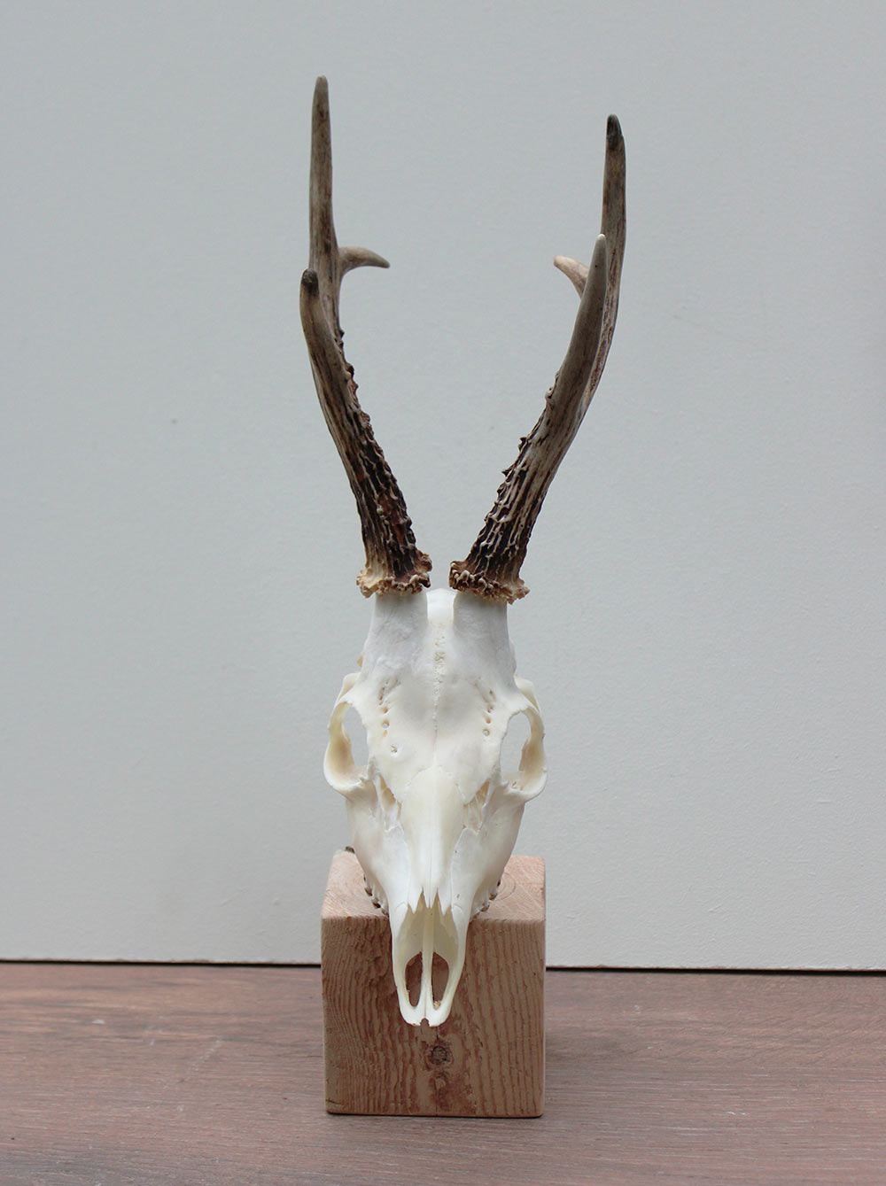 Mooi gebleekte zesender REE SCHEDEL op houten sokkel (9 x 9 x 9 cm). Lengte geweistangen 20 cm. Totale hoogte bedraagt 42 cm.