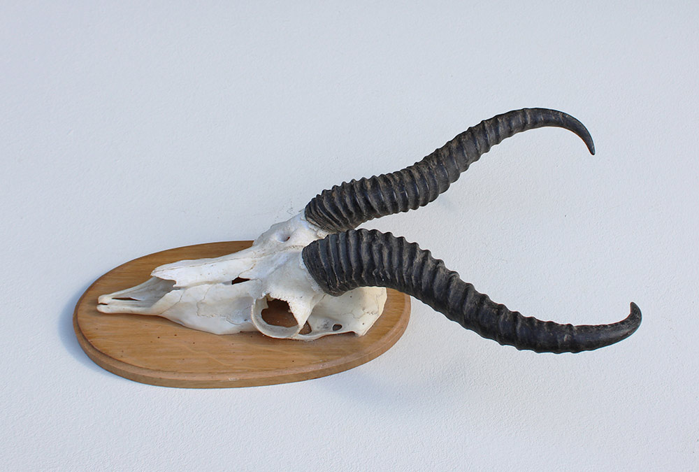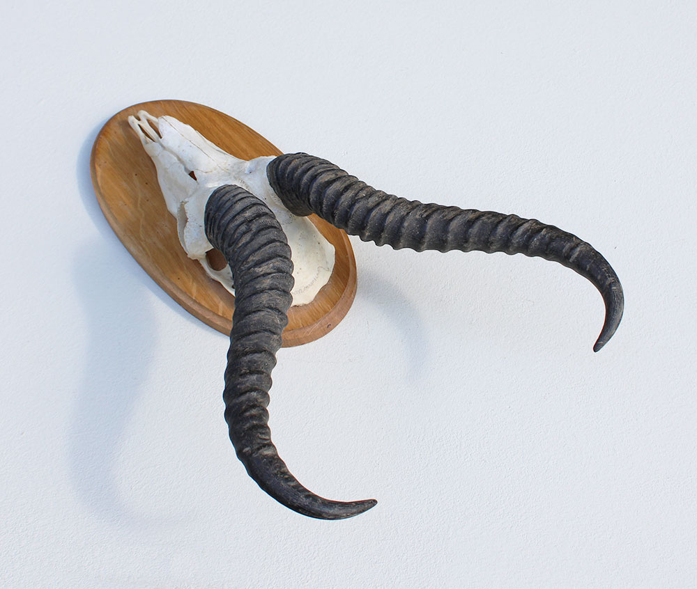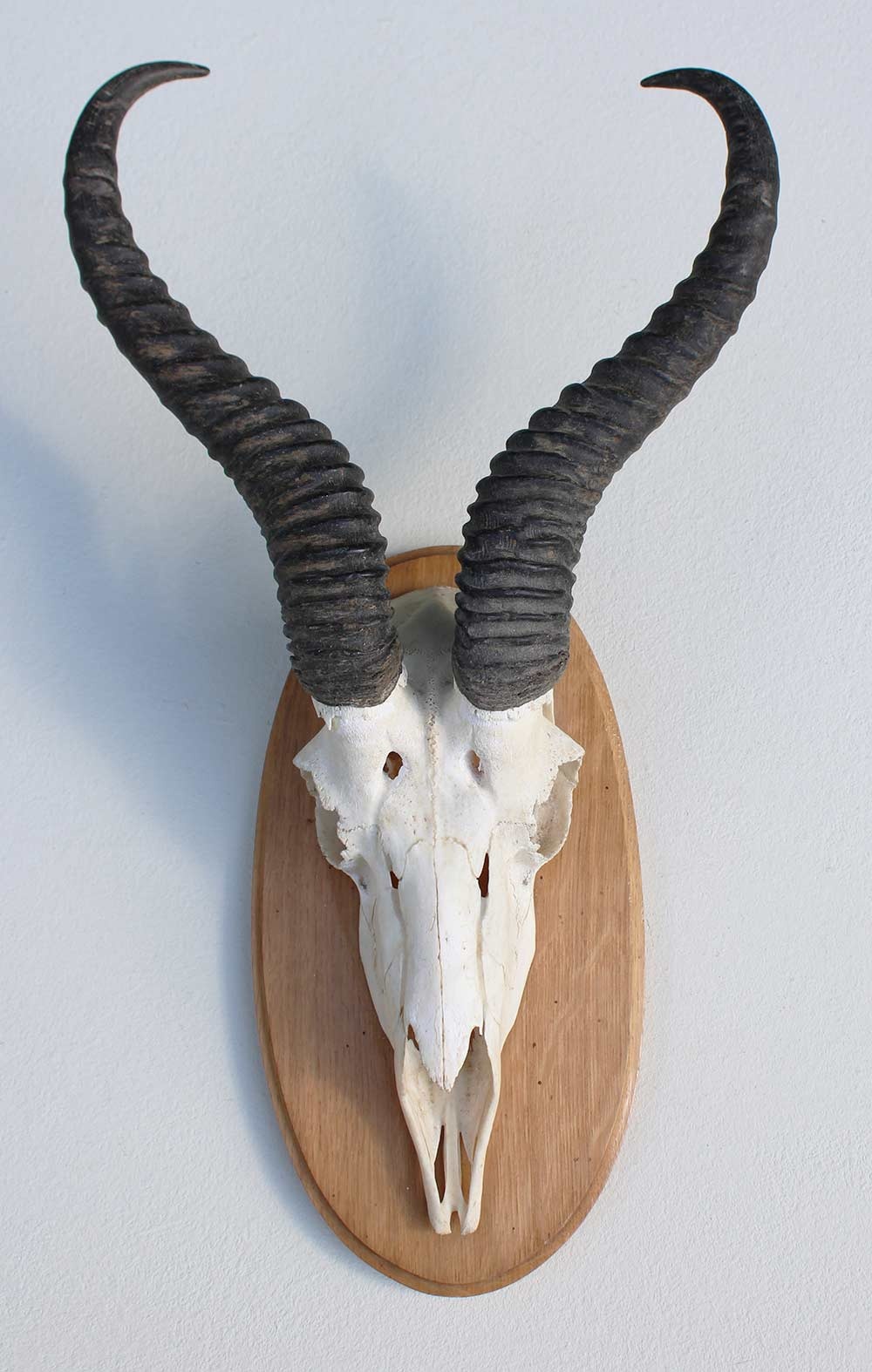 Schedel SPRINGBOK ANTILOPE op solide houten schild (28 x 14 cm). Lengte hoorns 30 cm. Het stuk is 26 cm breed en 42 cm hoog.