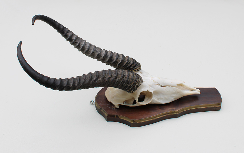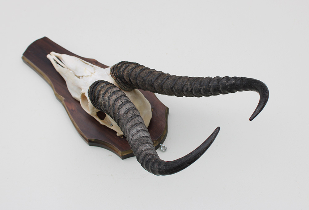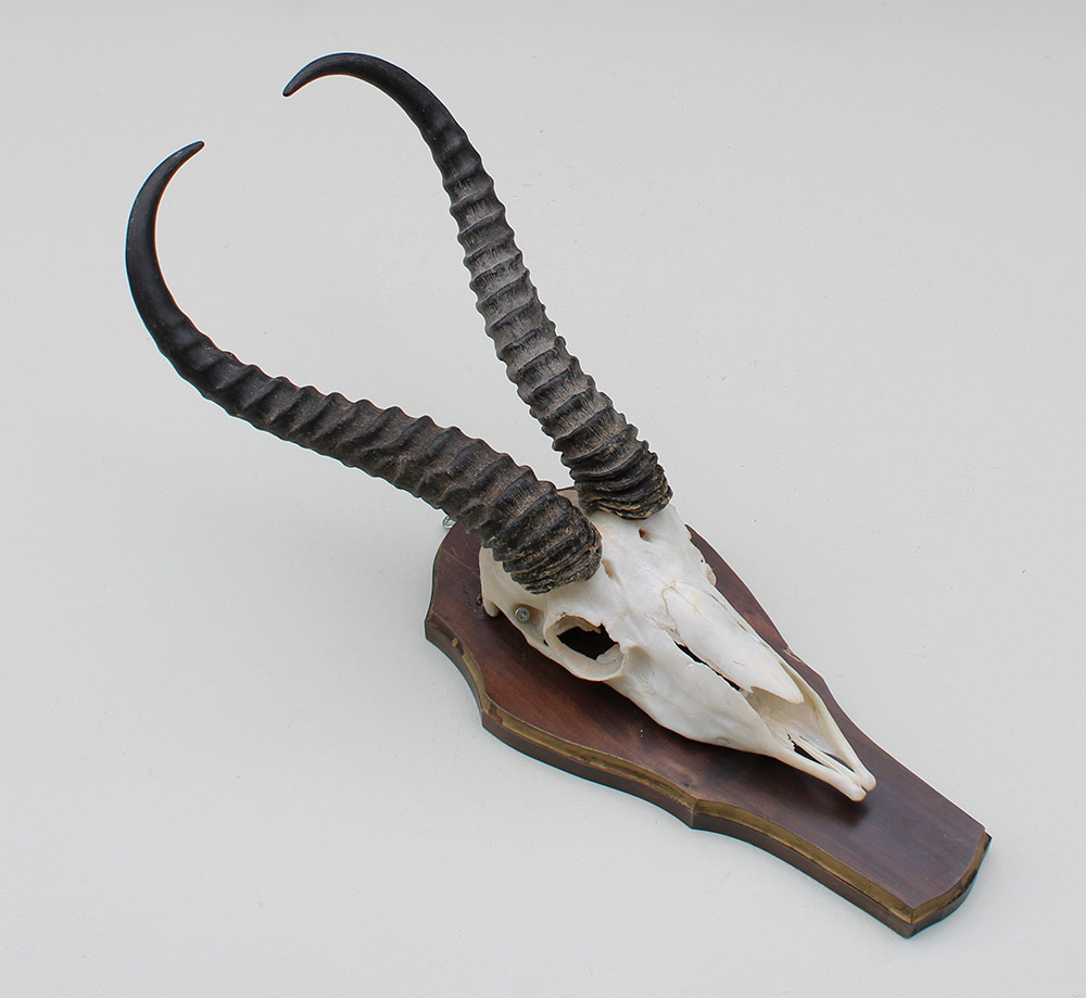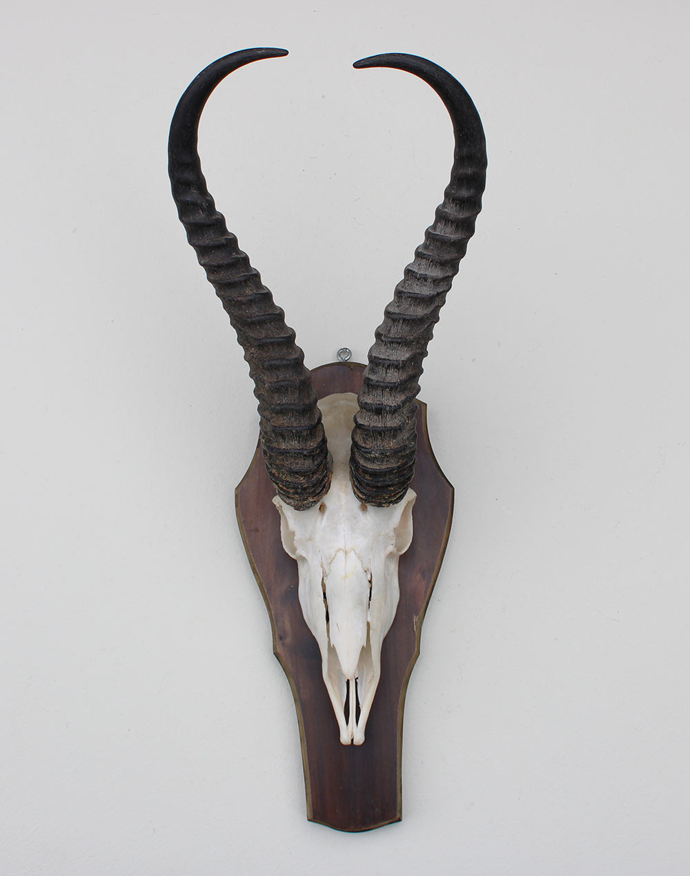 Schedel SPRINGBOK ANTILOPE op solide houten schild. Lengte hoorns 35 cm. Het stuk is 19 cm breed en 45 cm hoog. Diepte 25 cm. Maat schild 34 x 16 cm