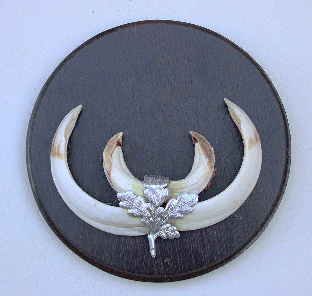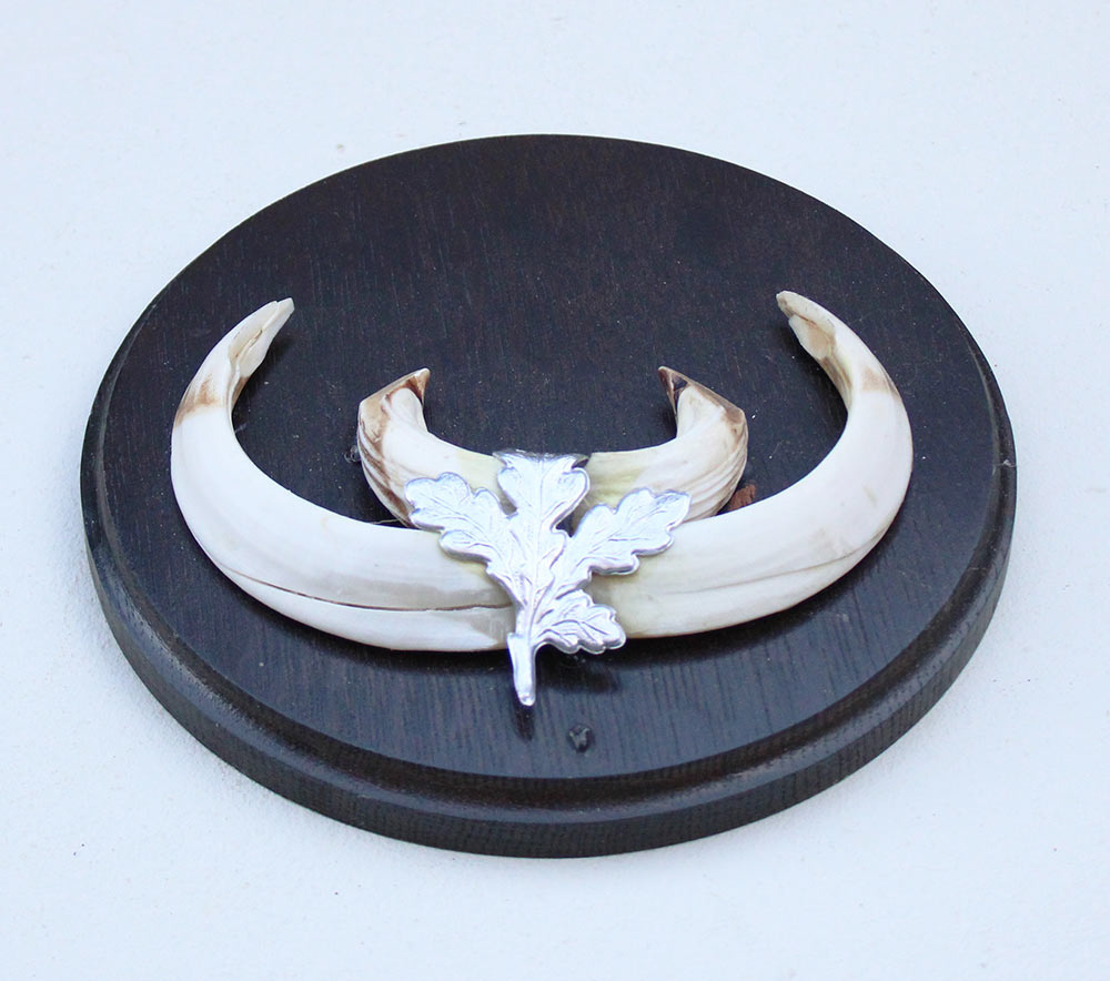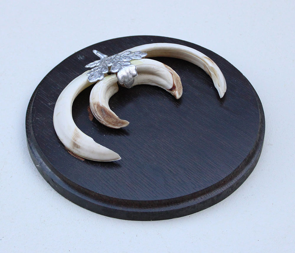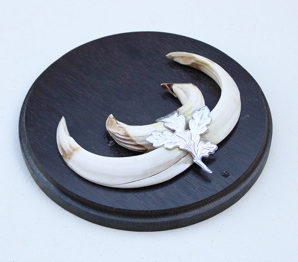 Schild tanden EVERZWIJN / WILD ZWIJN afgewerkt met aluminium loof bladeren. Schilddiameter 18 cm. Lengte tanden 13/6 cm.
