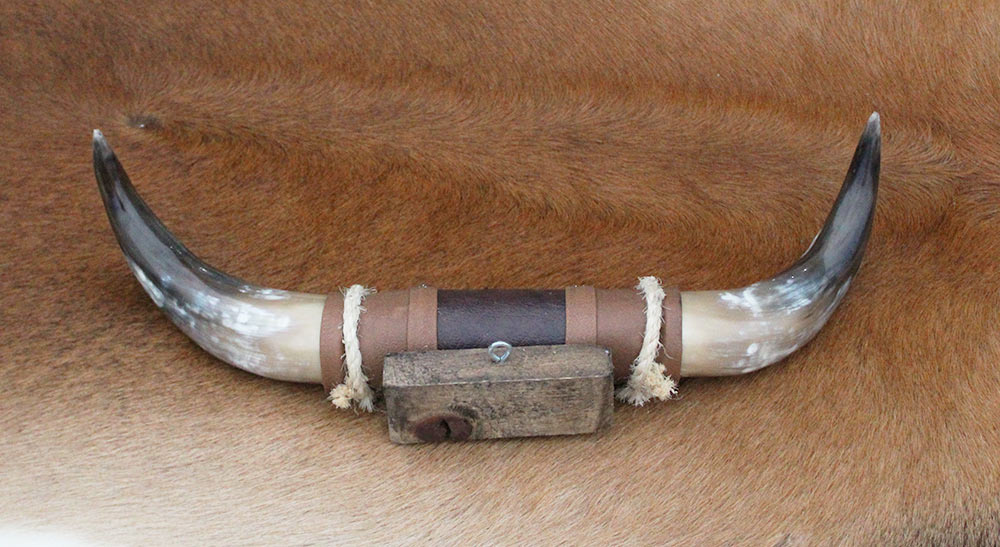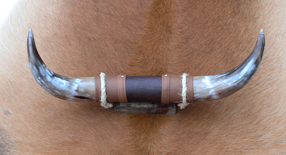 Texas style BULLBAR - afgewerkt met leer en sisaltouw. Mooi gepolijste hoorns. Voor aan de muur of op het dashboard van de bus! Het stuk is 47 cm breed.
