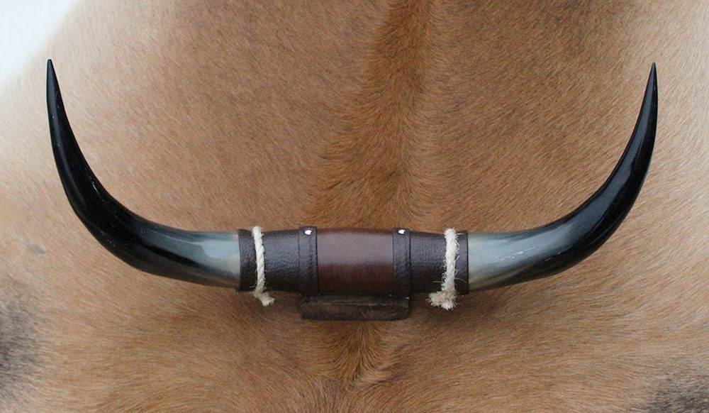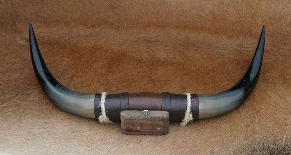 Texas style BULLBAR - afgewerkt met leer en sisaltouw. Mooie donkere gepolijste hoorns. Voor aan de muur of op het dashboard van de bus! Het stuk is 50 cm breed.