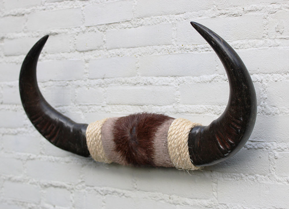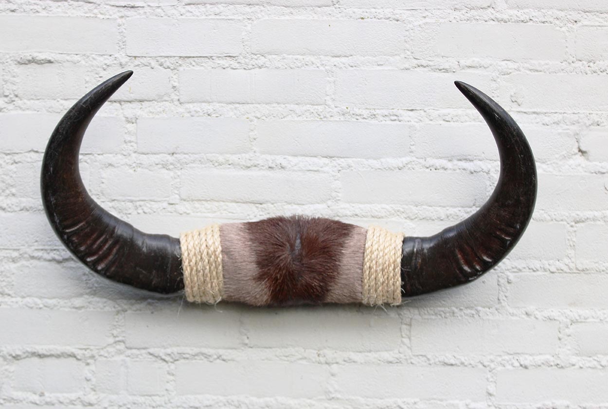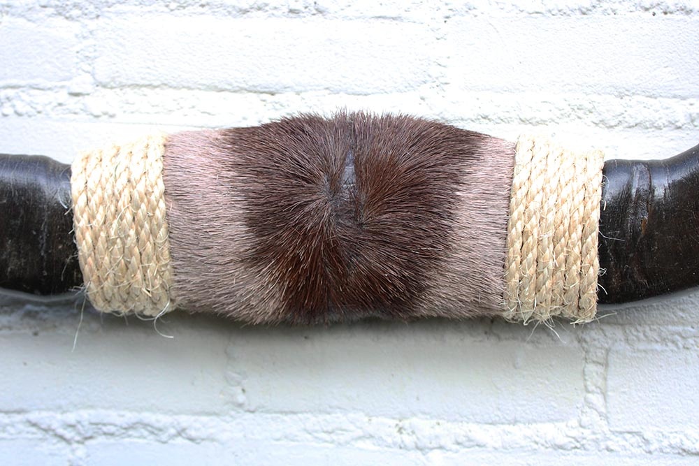 Texas style BULLBAR - waterbuffelhoorns - afgewerkt met vel en sisaltouw. Het stuk is 61 cm breed.