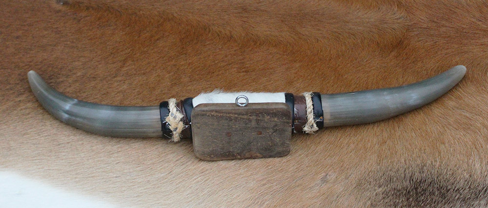 Texas style BULLBAR - afgewerkt met vel en sisaltouw. Mooie donkere gepolijste hoorns. Voor aan de muur of op het dashboard van de bus! Het stuk is 61 cm breed.