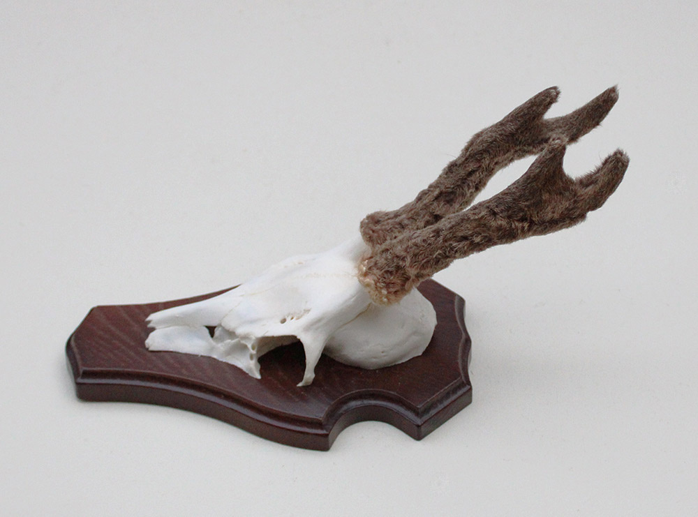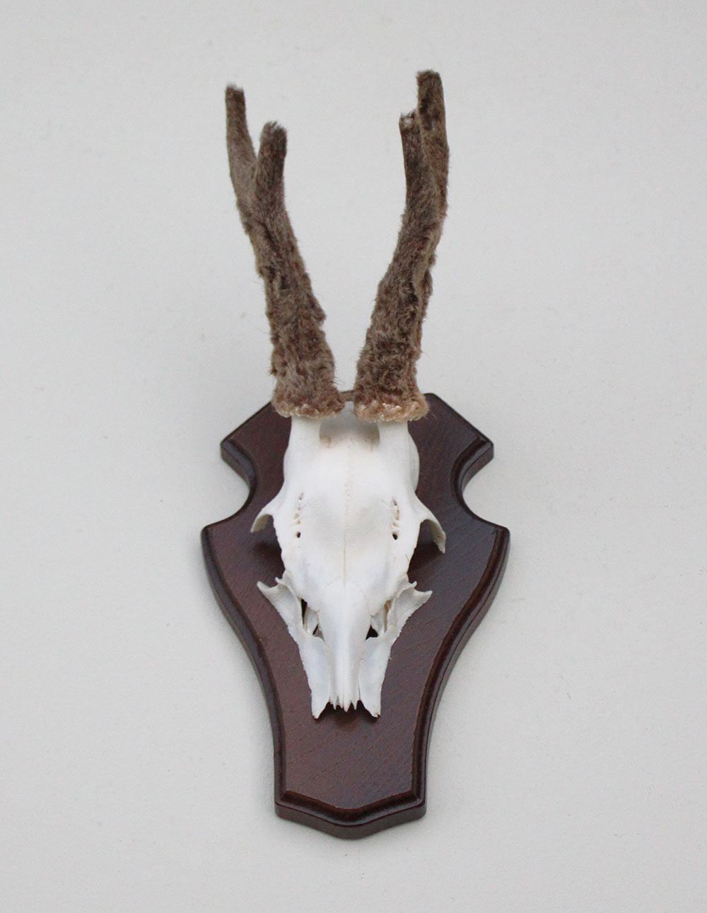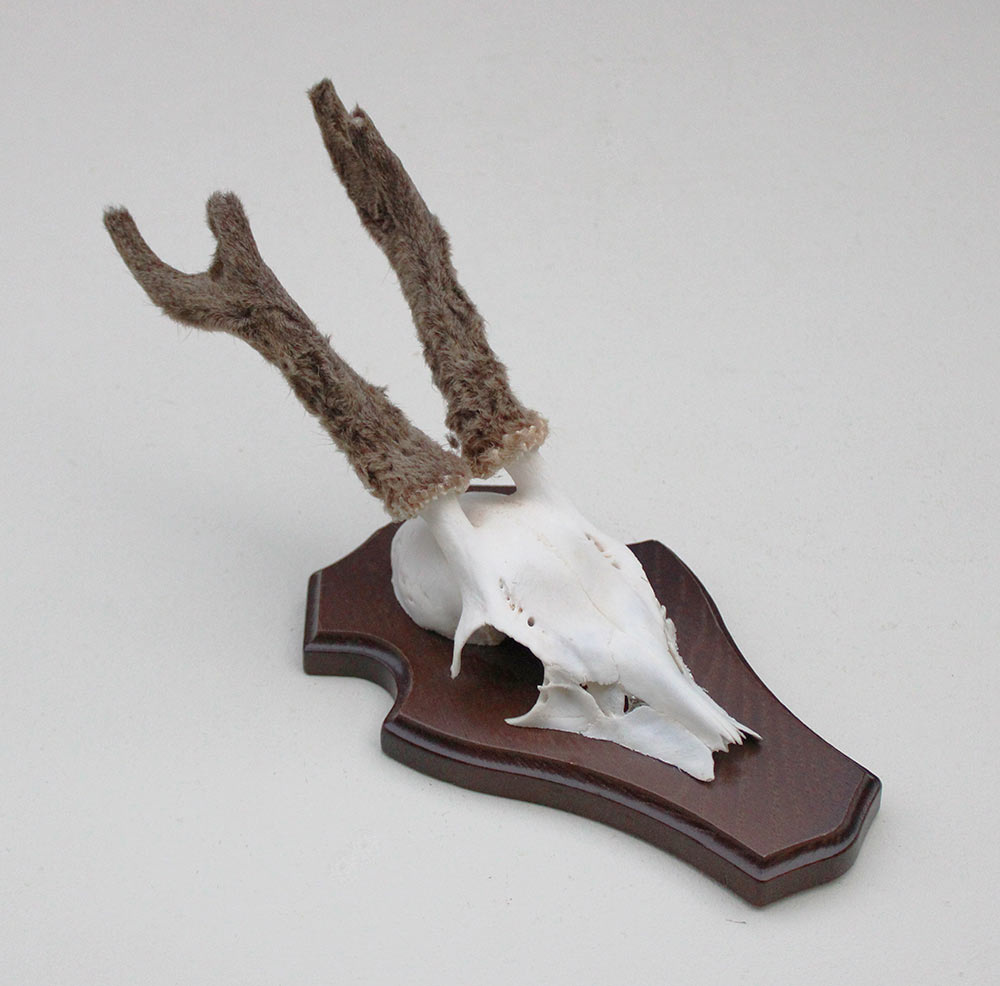 Engels BAST GEWEI REE op houten schild. Decoratief gewei, de stanglengte bedraagt 15 cm. Aan de achterzijde voorzien van kaakdeeltje.