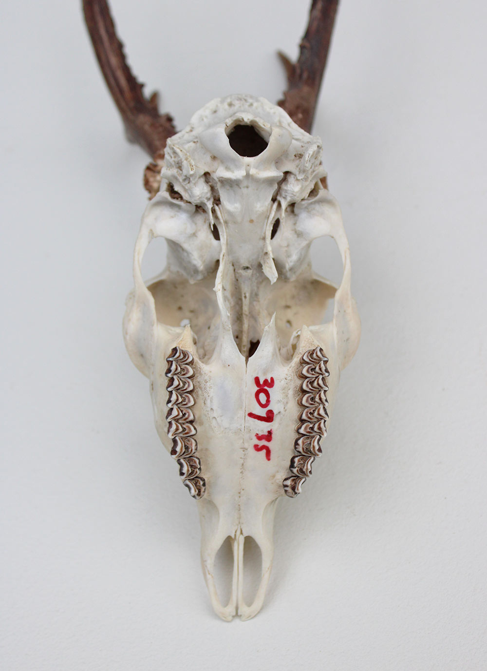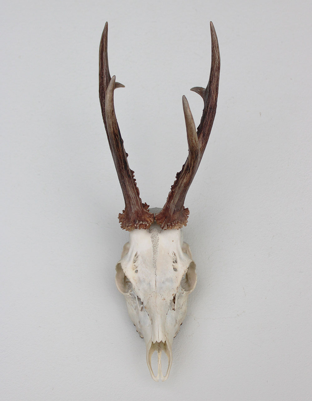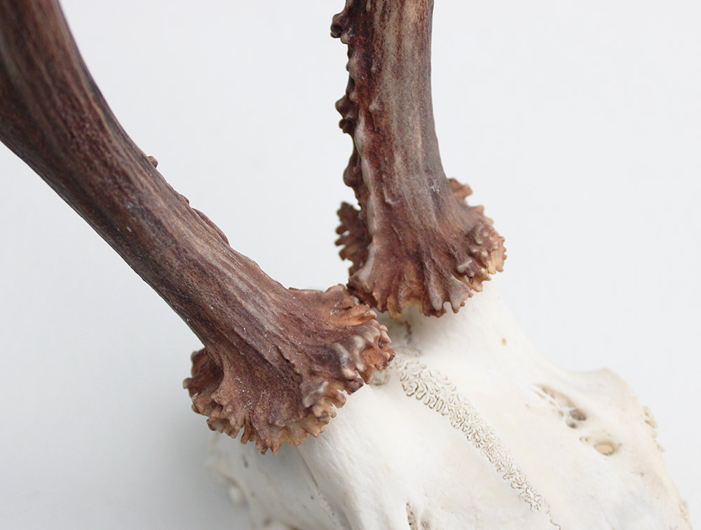 Mooi gebleekte schedel met zesender REE GEWEI - 365 gr. De stanglengte bedraagt 22 cm. Mooie volle rozen.